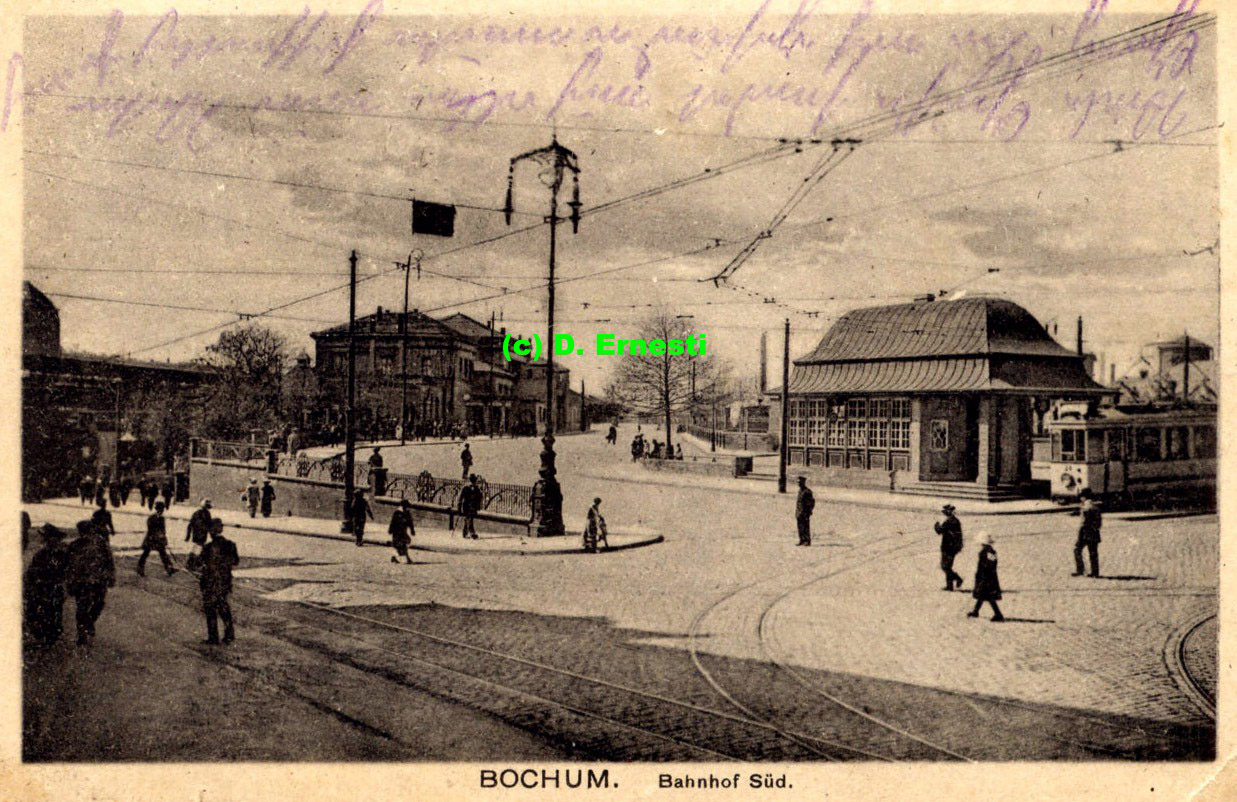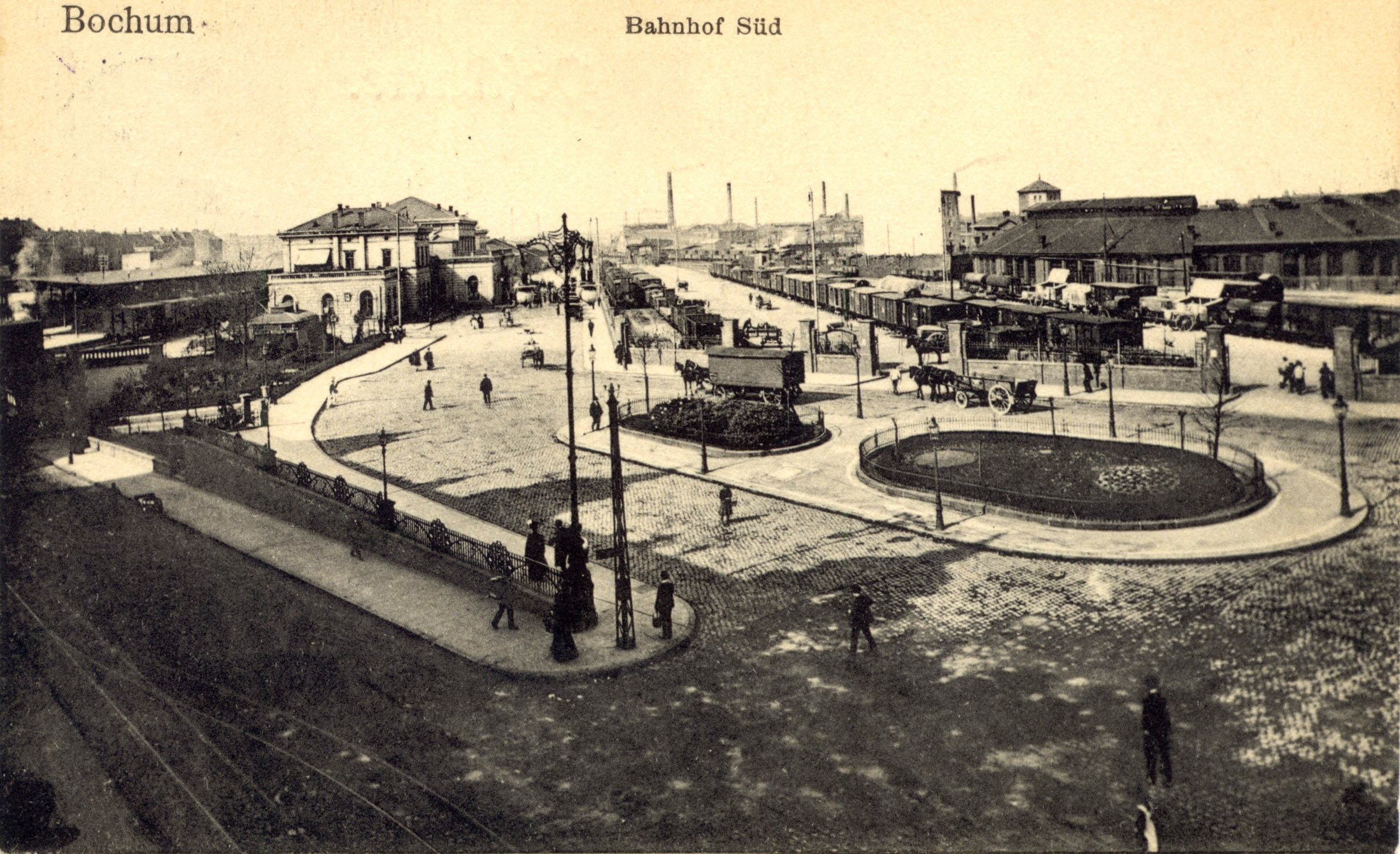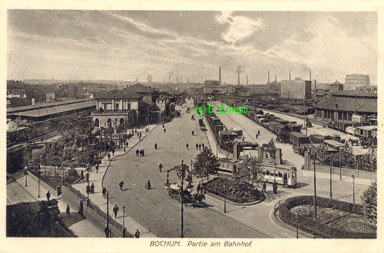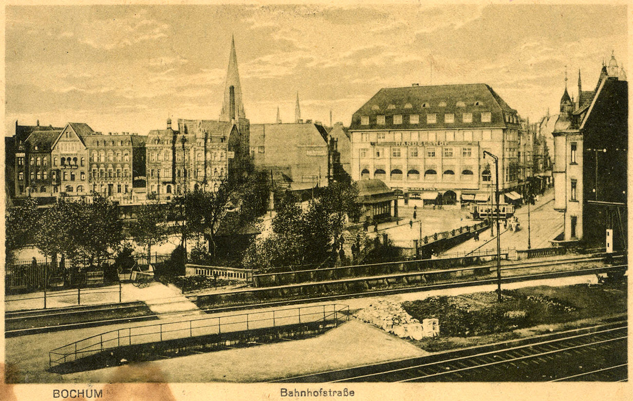 Ansichtskarte von 1915. Rechts aus dem Bild heraus gehen Bahnhofstraße und der Vorläufer der Viktoriastraße. Darüber der alte Ringlokschuppen. Am unteren, linken Bildrand die Unterführung - genannt 'Mausefalle', auf deren anderer Seite die Hattinger Straße begann. (Foto noch größer sehen - hier klicken!) |