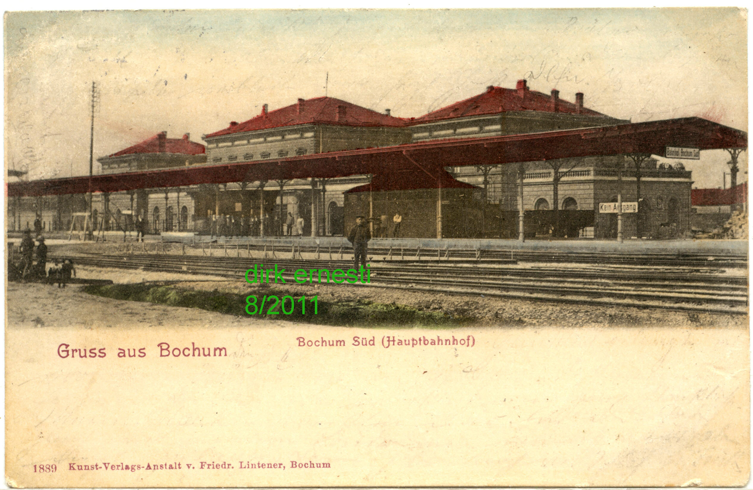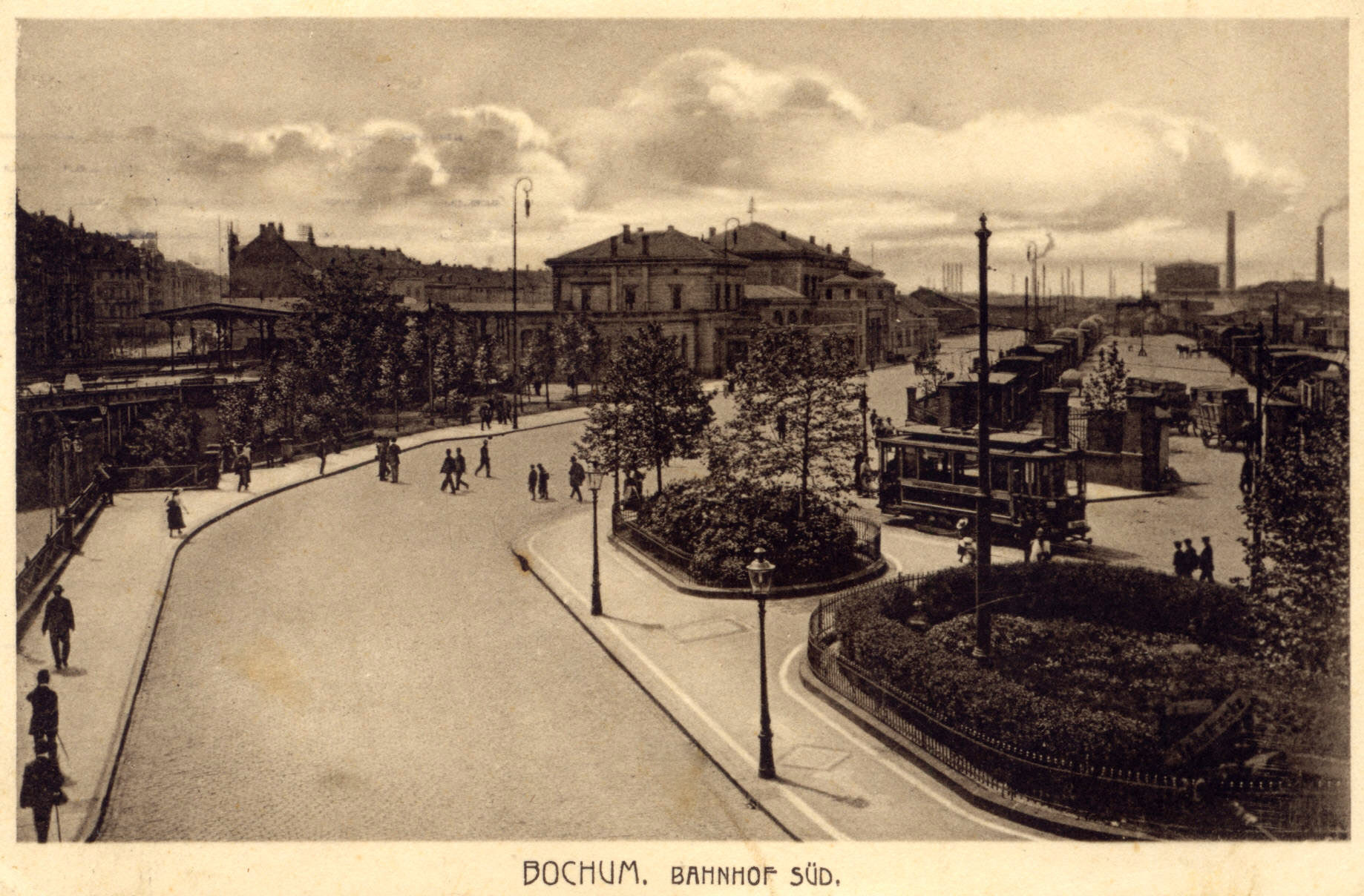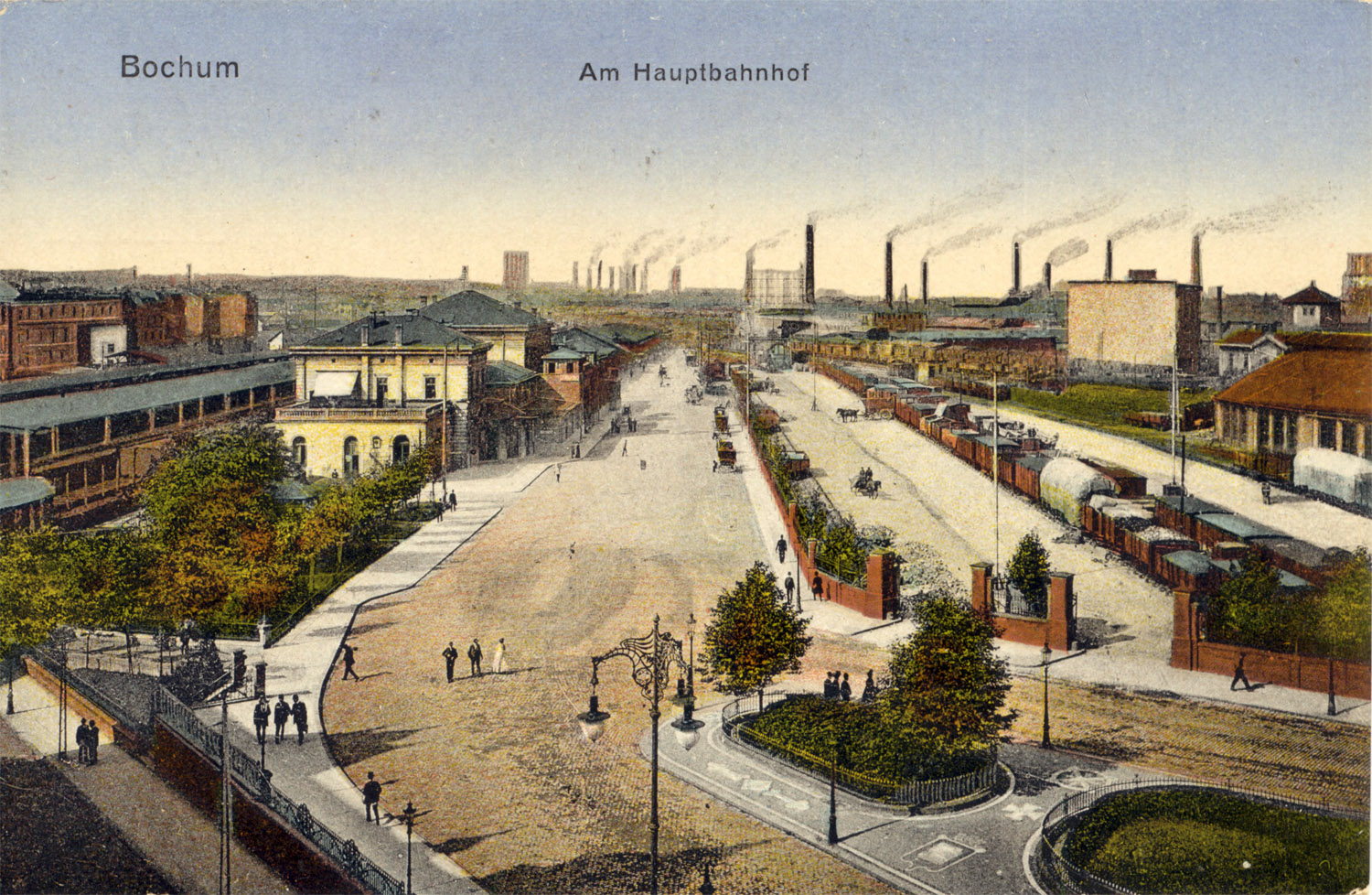 Ansichtskarte von 1915. Rechts aus dem Bild heraus gehen Bahnhofstraße und der Vorläufer der Viktoriastraße. Darüber der alte Ringlokschuppen. Am unteren, linken Bildrand die Unterführung - genannt 'Mausefalle', auf deren anderer Seite die Hattinger Straße begann. (Foto noch größer sehen - hier klicken!) |