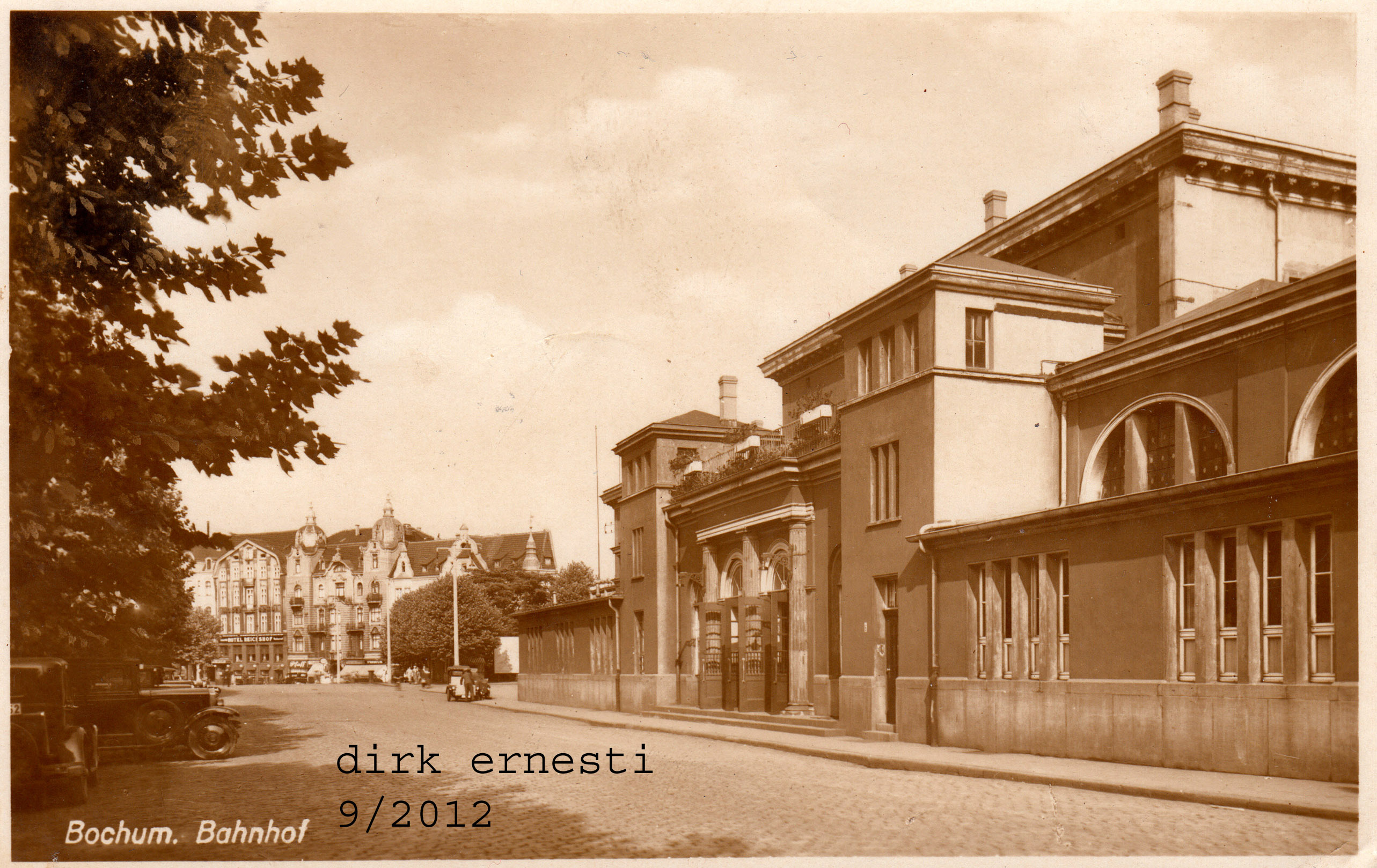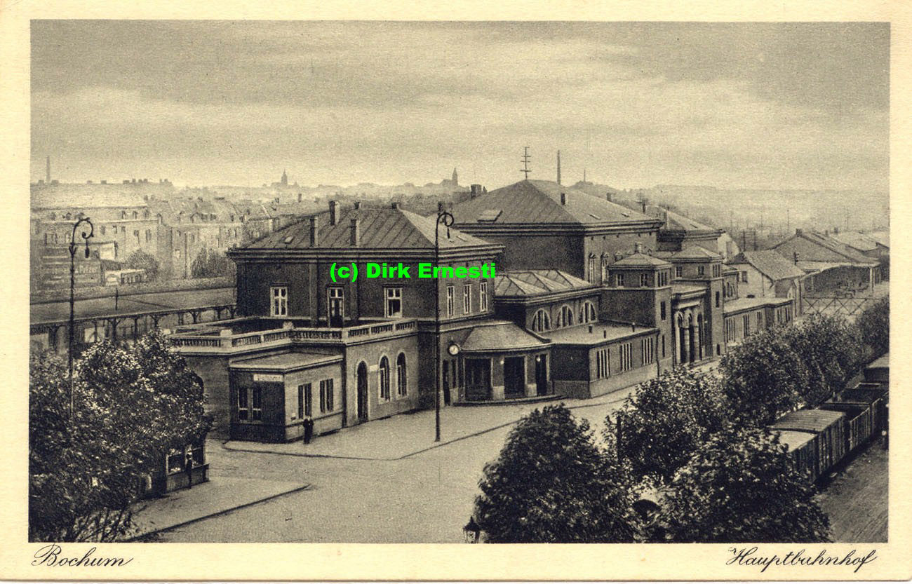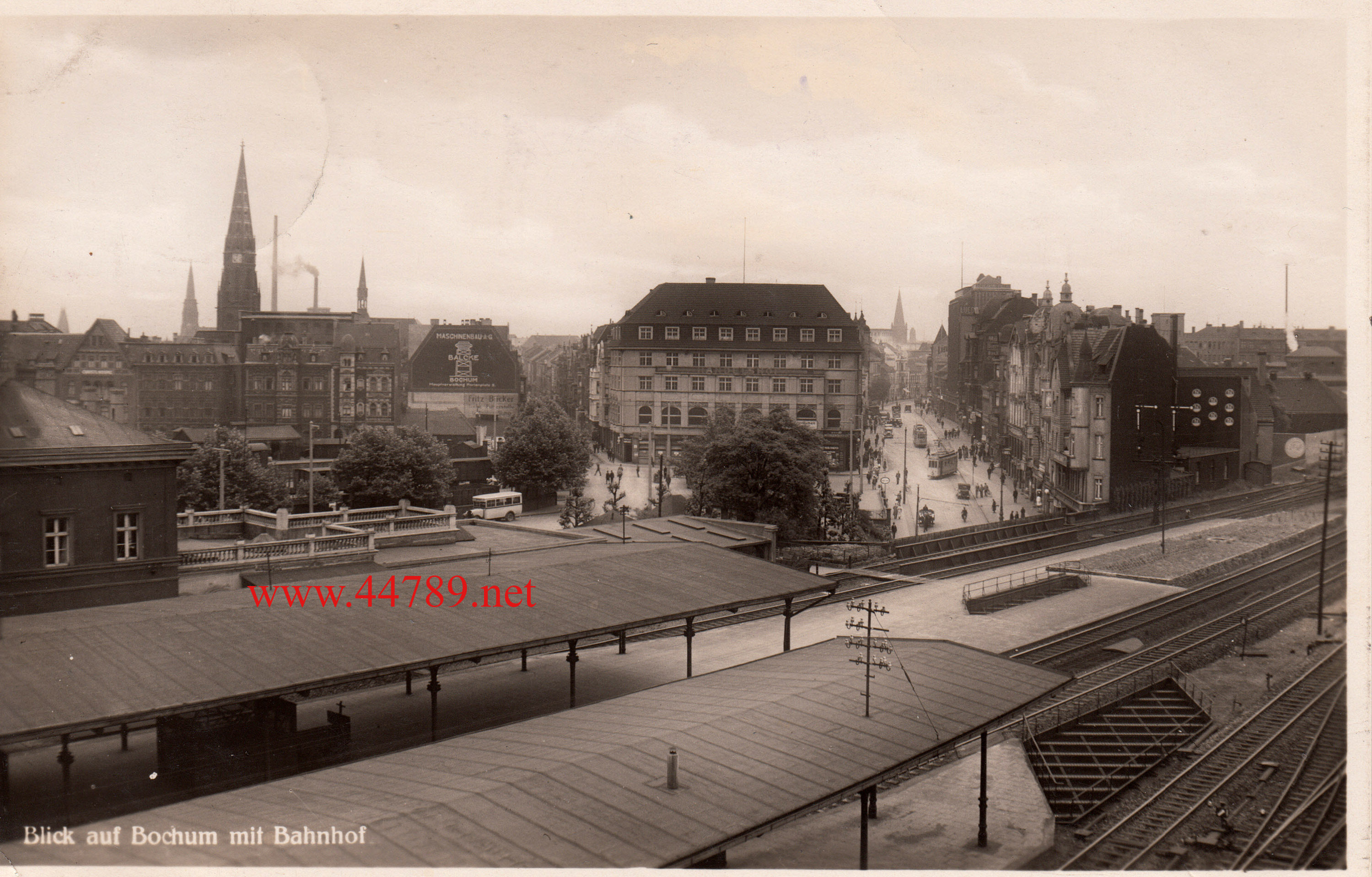 Postkarte, gestempelt 1933. schöne, eher seltene Ansicht: offenbar aus einem höheren Stockwerk vom "Café Industrie" in der (alten) Hattinger Straße: man sieht die Bedachung der Gleise, den Verlauf der Bahnhofstraße (Kortumstr.) mit Handelshof und die Marienkirche links. (Foto noch größer sehen - hier klicken!) Vgl. auch letztes Bild in dieser Serie |