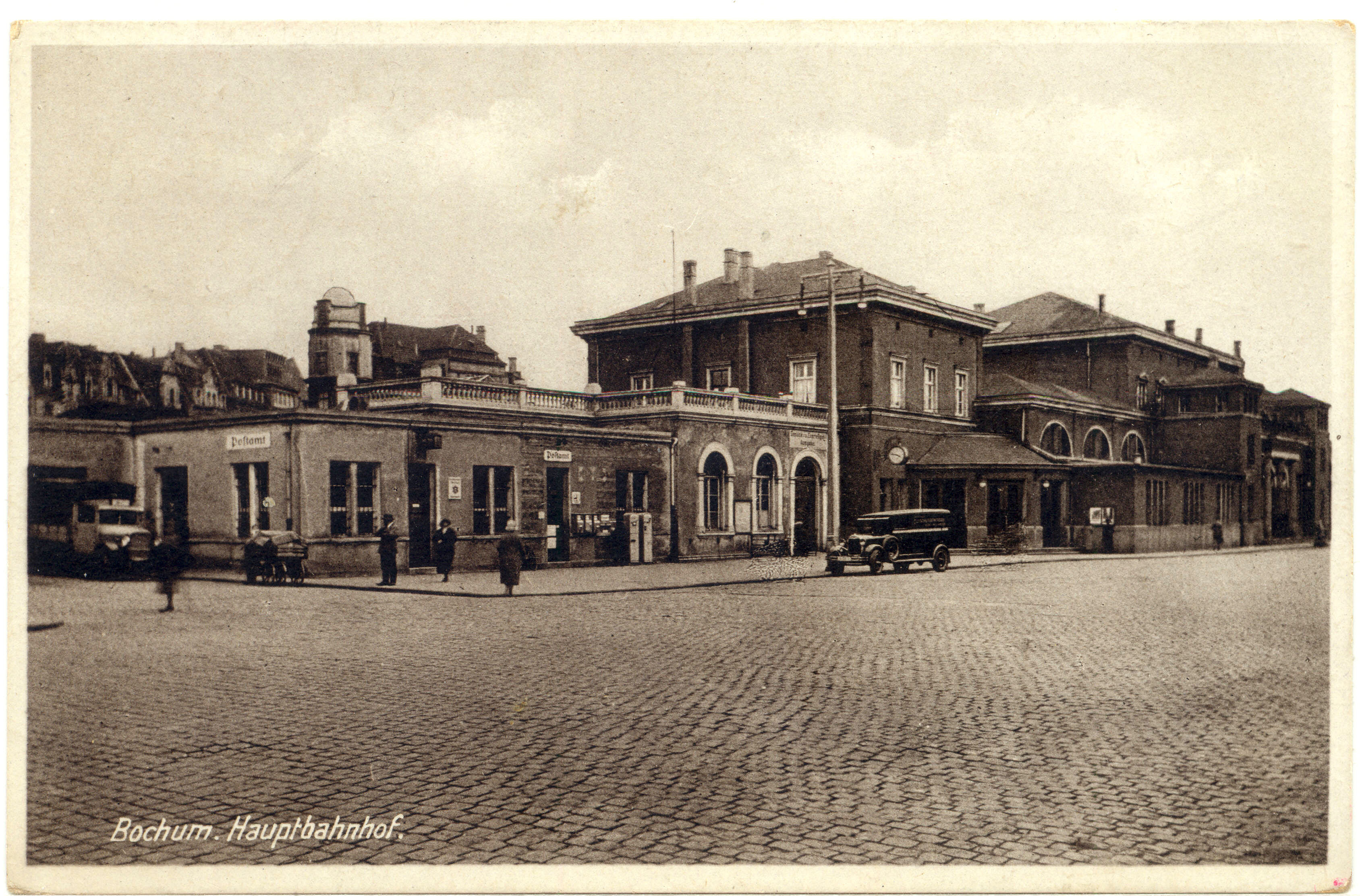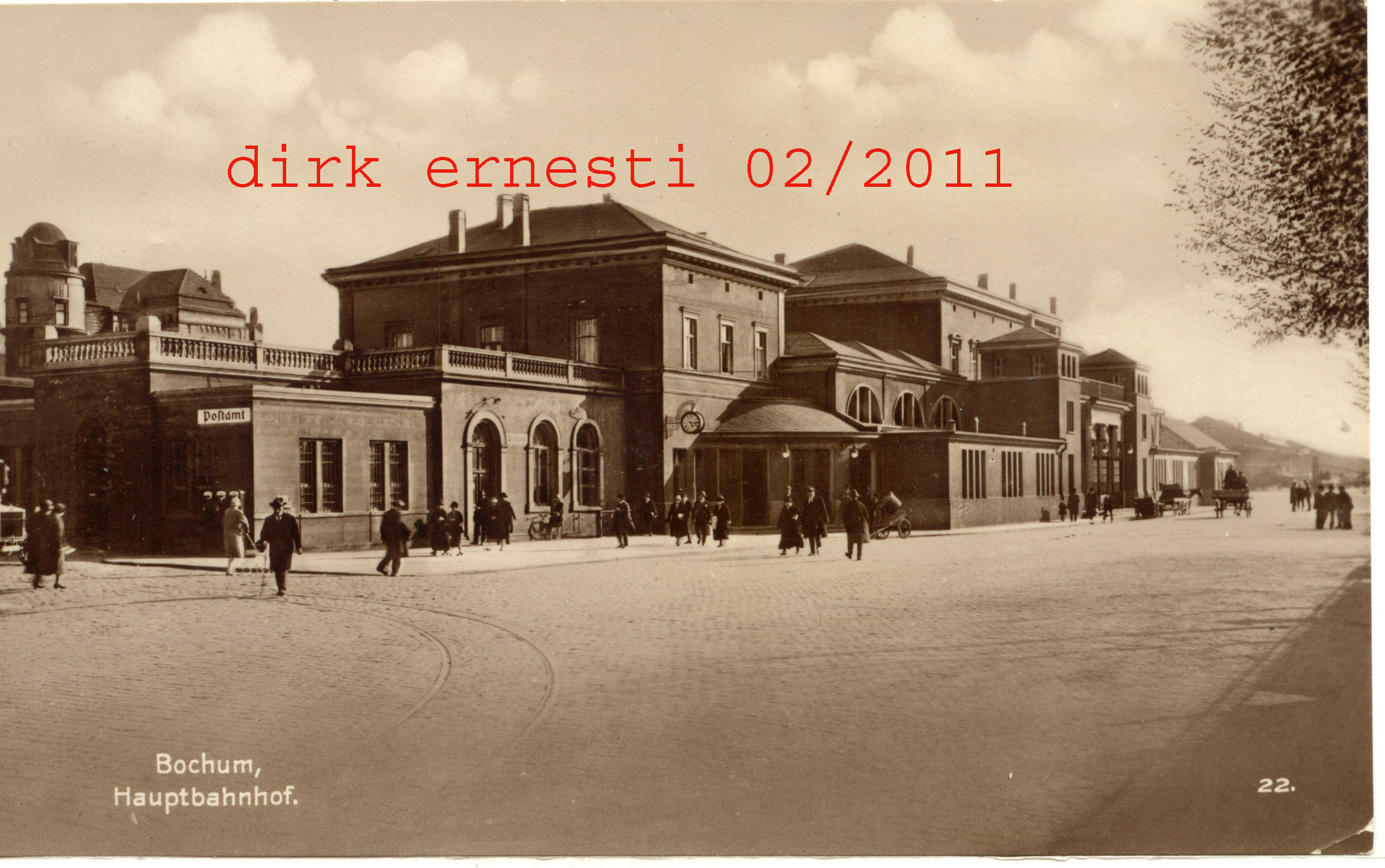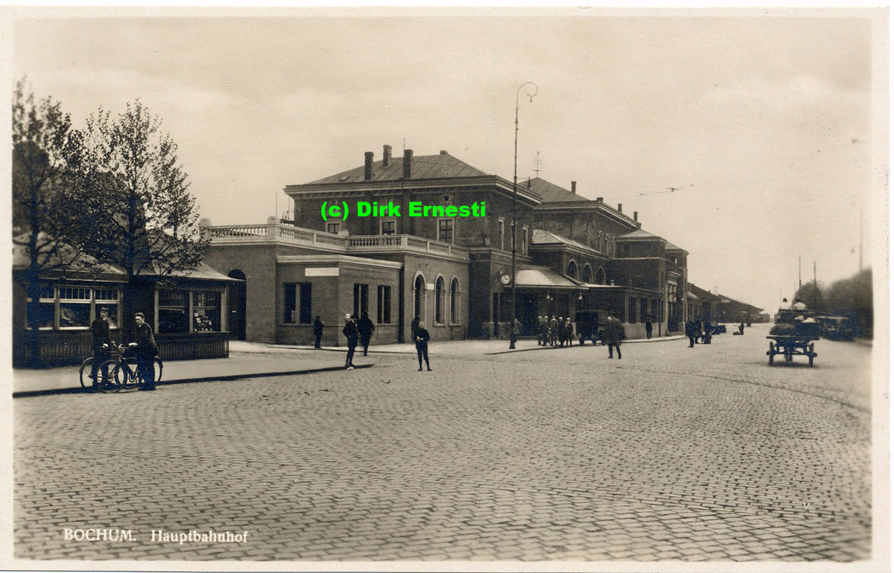 Postkarte, gestempelt 1933. schöne, eher seltene Ansicht: offenbar aus einem höheren Stockwerk vom "Café Industrie" in der (alten) Hattinger Straße: man sieht die Bedachung der Gleise, den Verlauf der Bahnhofstraße (Kortumstr.) mit Handelshof und die Marienkirche links. (Foto noch größer sehen - hier klicken!) Vgl. auch letztes Bild in dieser Serie |