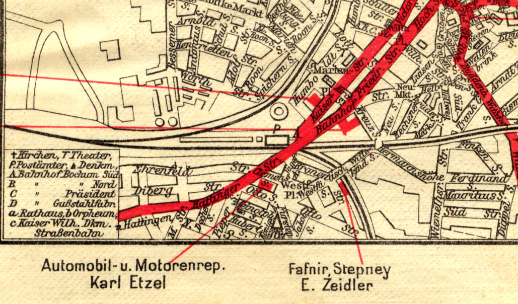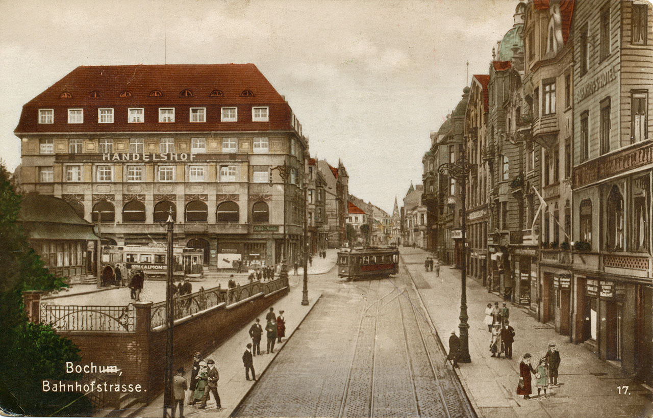 Ansichtskarte, gelaufen 1923. interessantes Detail: bei Vergrößerung kann man die Werbeschrift von Otto Doppmeier, technischer Großhandel in der Ehrenfeldstraße 34 gut entziffern. Direkt dahinter die Schornsteine vom Stahlwerk Weitmar, Rombacher Hütte. (Foto noch größer sehen - hier klicken!) |