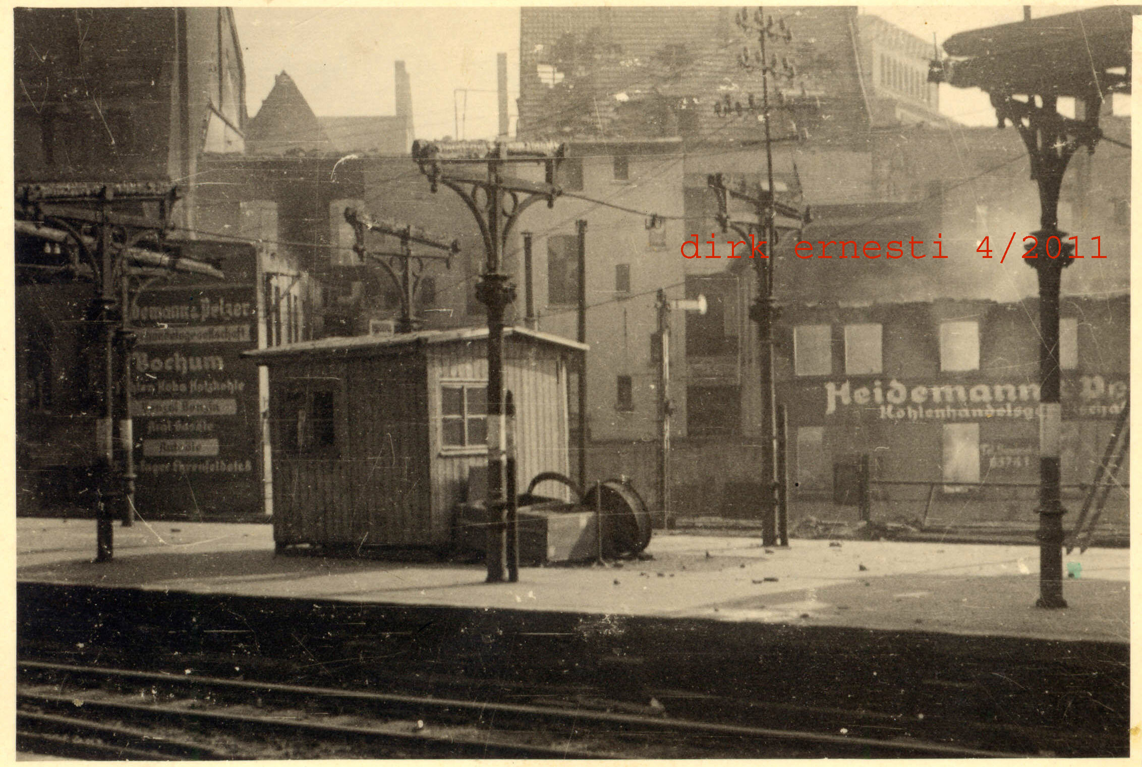 Foto aus unbek. Quelle, 30.9.1943. Teile des überdachten Bereiches am Bahnsteig offenbar getroffen, ferner Treffer an Häusern im Hintergrund, rechts die markante Struktur des "Bürohauses" in der Hattinger Straße erkennbar. (Foto noch größer sehen - hier klicken!) |