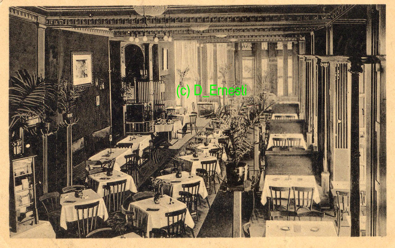 Ansichtskarte, hergestellt 1910. Innenansicht, koloriert. Text rückseitig: Hotel Rest.. Besitzer Aug. Stüermann. Elektrisches Licht - Zentralheizung - Billiard-Salon. 2 Min. vom Hauptbahnhof. Täglich Künstler-Konzert. Zimmer von 2,50 Mk. an. (noch größer sehen - hier klicken!) |