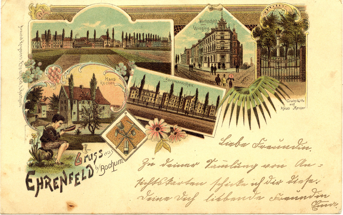 Ansichtskarte von 1899. befand sich auf der Straßenecke Ehrenfeldstraße/Hattinger Straße. Hier stadtauswärts gesehen. (Siehe auch: Bildergalerie Hattinger Straße, 9. Bild von oben). Die Karte zeigt ferner (Vergrößerung anwählen!) das Haus Rechen, Bergmannsheil, Grabstätte auf Haus Rechen und eine Gesamtansicht vom Ehrenfeld - evtl. auch die Hattinger Straße. (Karte noch größer sehen - hier klicken!) |