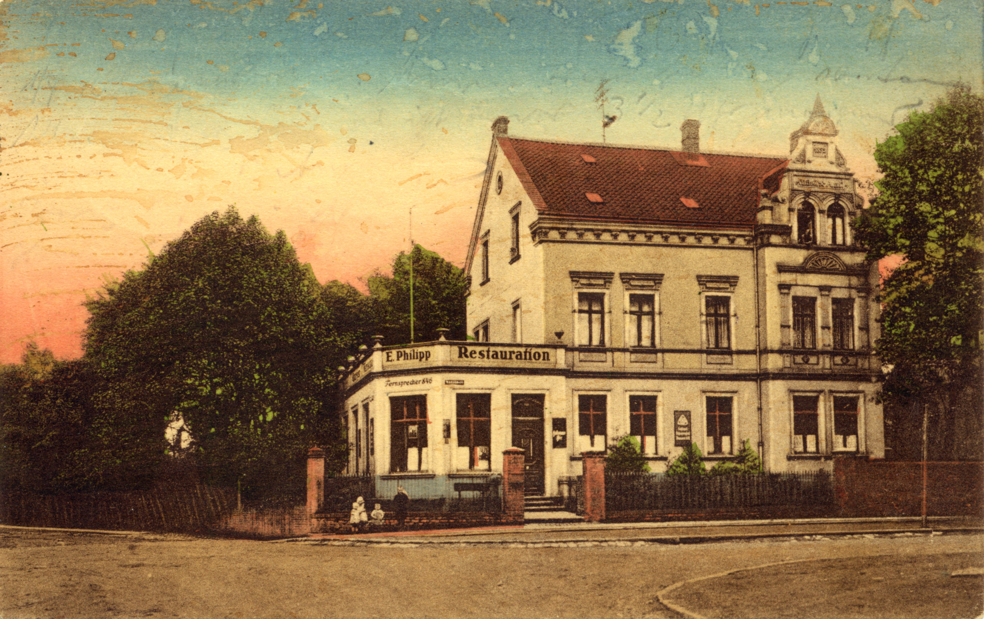 Ansichtskarte von 1910. Das Haus lag etwa an der Stelle, wo die Hunscheidtstraße auf die Wasserstraße trifft, dort an der südlichen Seite der Wasserstraße. Das Gebäude existiert nicht mehr. |
