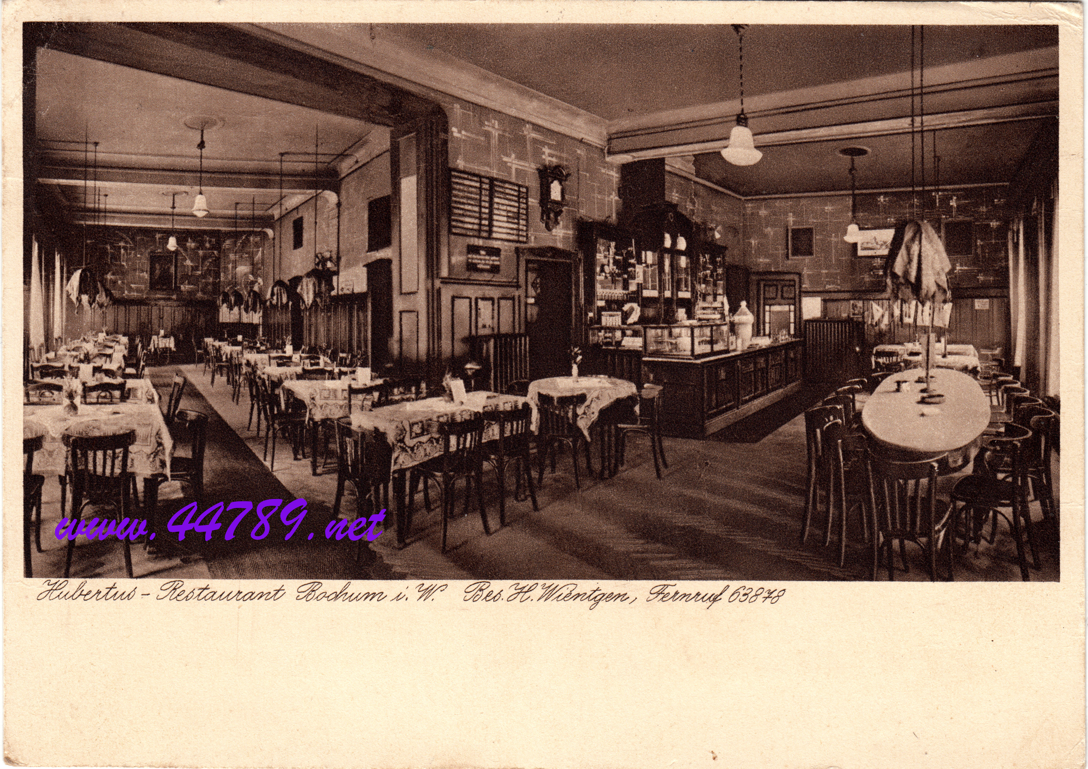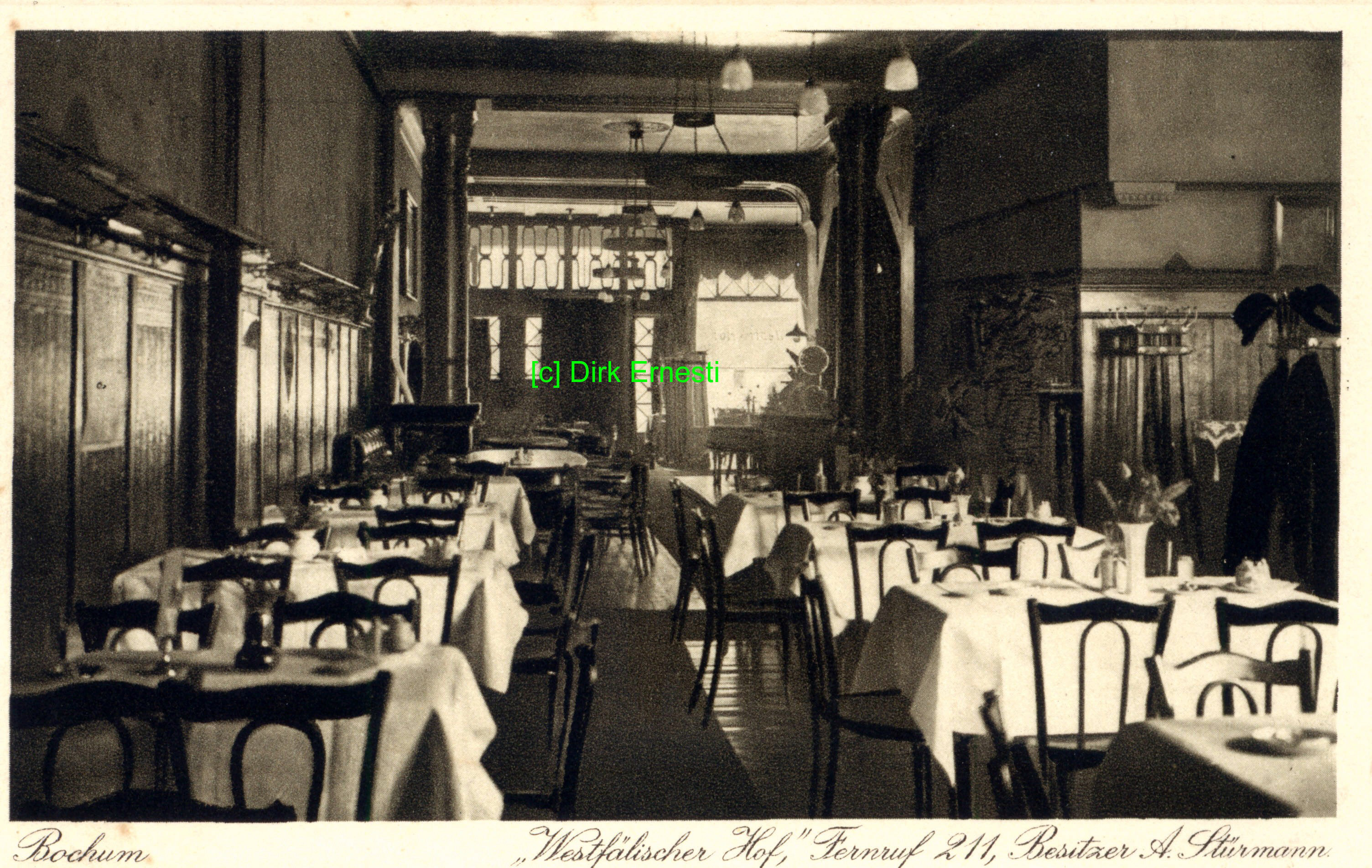 Ansichtskarte von 1929. Besitzer H. Biermann, "Vornehmes Familienlokal. Bekannt gute Küche, Gepflegte Weine und Biere" So der rückseitige Text. Das Lokal befand sich rechts nebem dem Hotel-Gasthof Westfälischer Hof in der Hattinger Straße, Ecke Dibergstr. (vgl. Galerie Hattinger Str.) |
