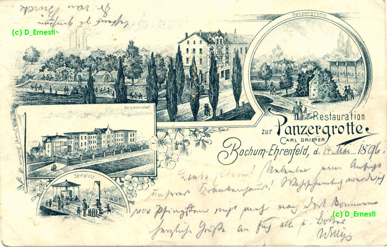 (Inhaber Carl Driefer). Ansichtskarte von 1894. Bisher älteste Ansichtskarte, die wir gefunden haben! - weitere Ansichten weiter unten. ... befand sich etwa auf Höhe des Bergmannsheils an der Hattinger Straße Nr. 80. Interessant: das Ehrenfeld wird schon vor dem Jahr 1900 erwähnt. (Karte noch größer sehen - hier klicken!) |