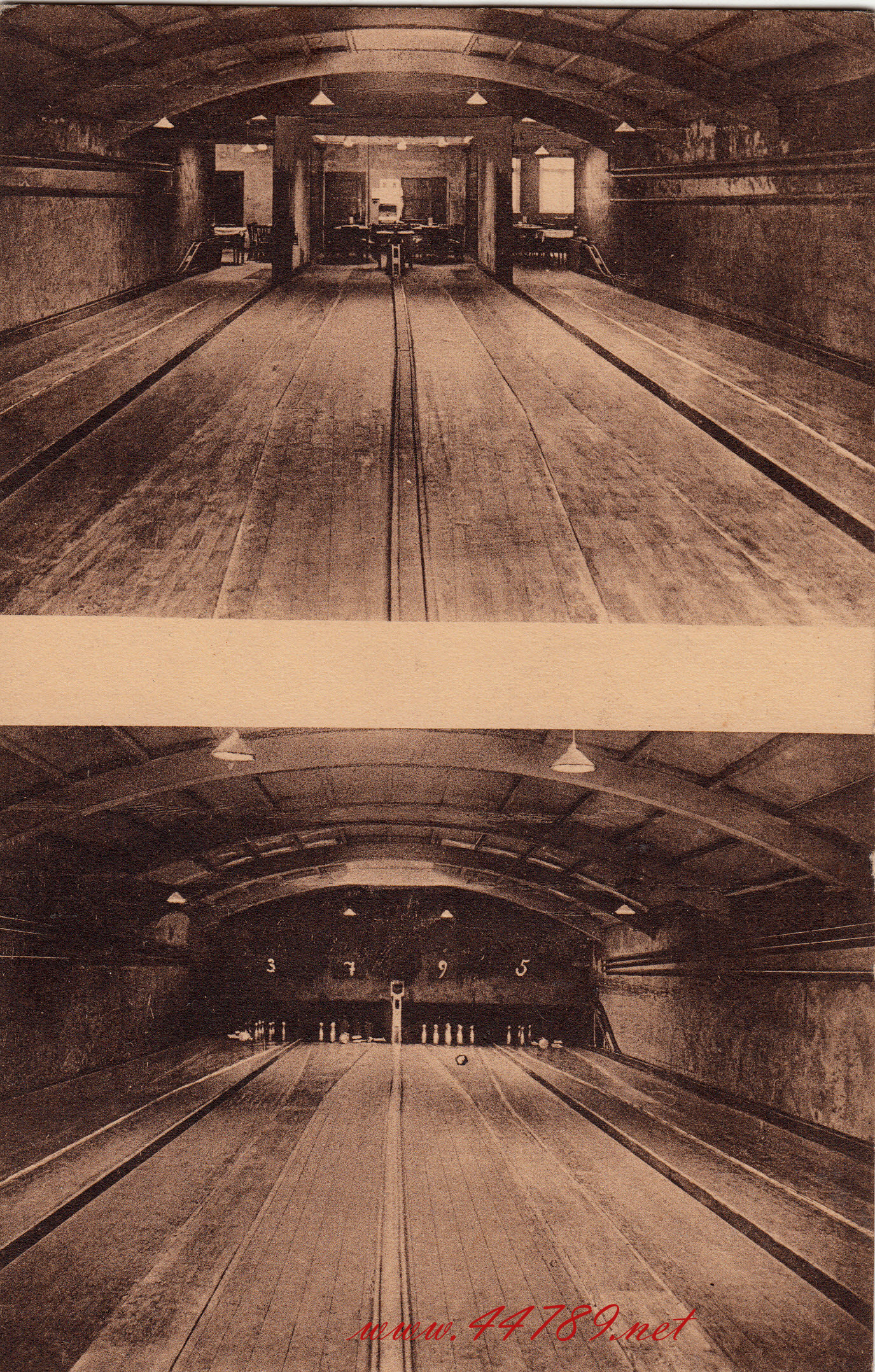 Ansichtskarte von 1927. zeigt auf 2 Bildern die Kegelbahn im Keller oder Anbau aus zwei Perspektiven. (Foto noch größer sehen - hier klicken!) |