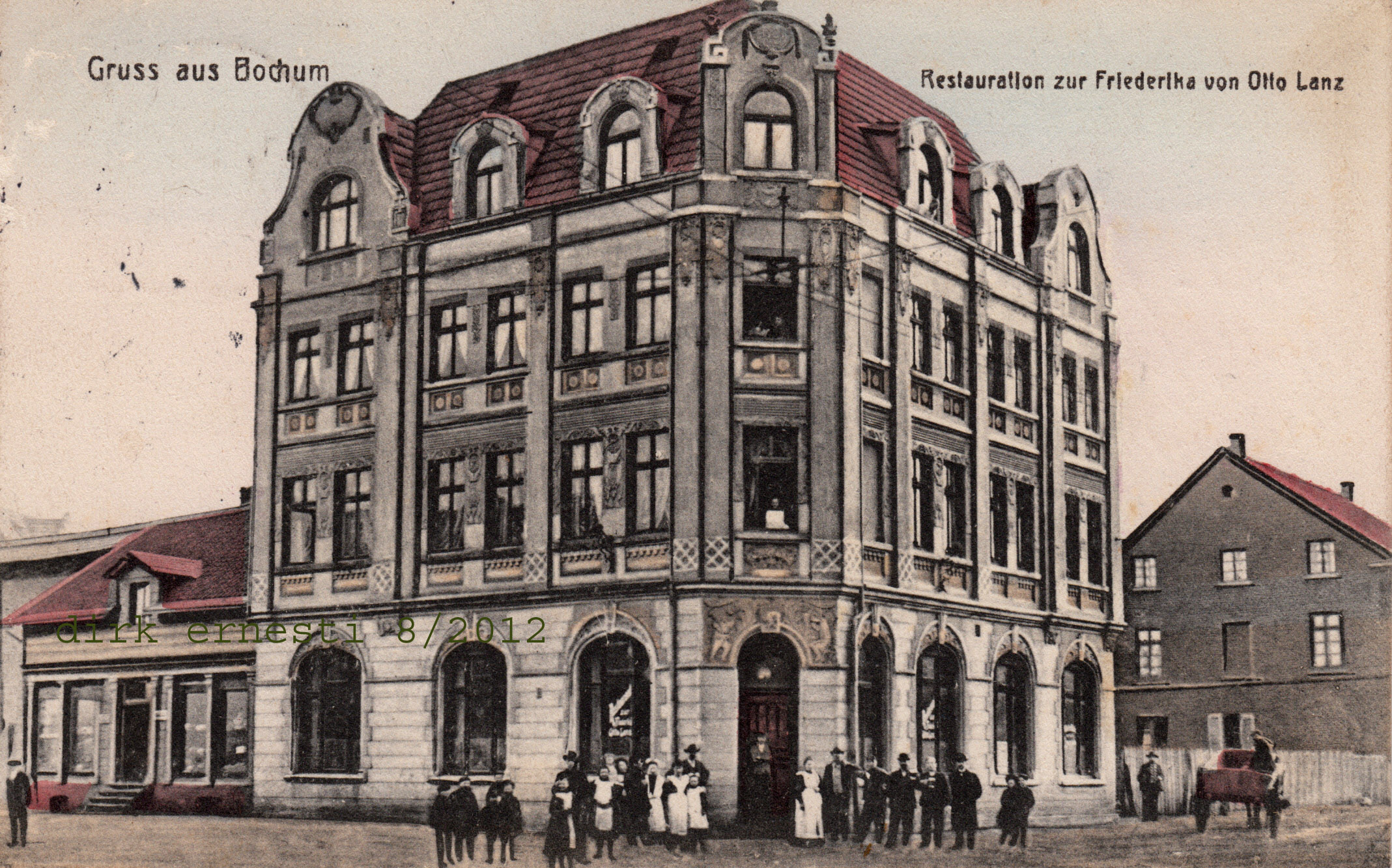 Wiemelhauser Str. 105. (Inhaber: Otto Lanz). Ansichtskarte von 1910. Das Haus stand dort, wo heute die "HSG - Hochschule für Gesundheit" ist - Universitätsstr. 105, Ecke "An der Schalwiese". Der Name "Friederika" weist auf die gegenüber gelegene, ehem. Zeche Friederika hin. In den Nachkriegsjahren war an dieser Stelle auch eine Aral-Tankstelle, siehe Bilder im Bereich "Private Fotos" auf dieser Webseite. (Foto noch größer sehen - hier klicken!) |