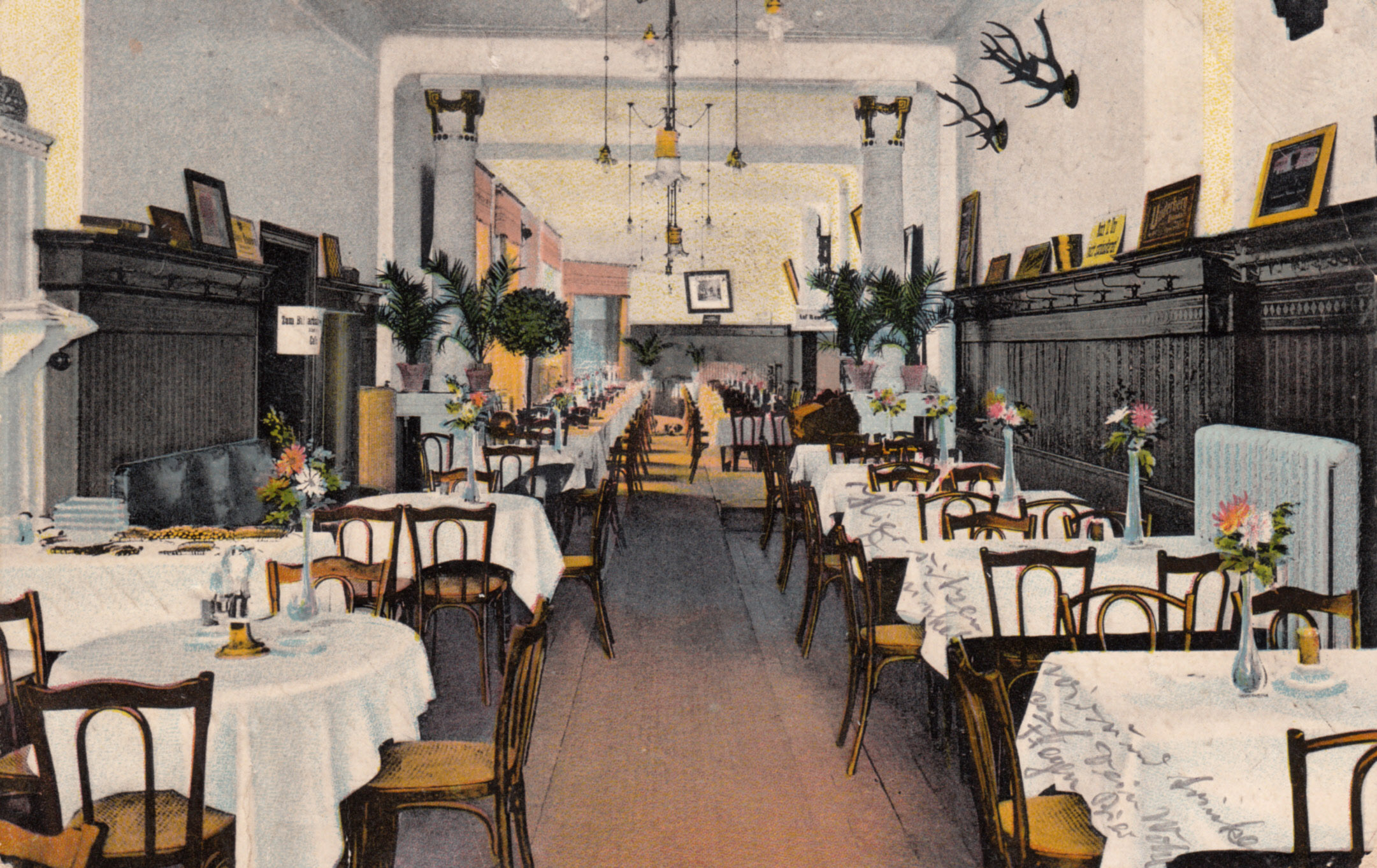 Ansichtskarte von 1935. Blick in den Gastraum (Eckhaus Pieperstr./Hubertusstraße, im Krieg zerstört, heute befindet sich an derselben Adresse wieder eine Gaststätte- "Aubergine") |