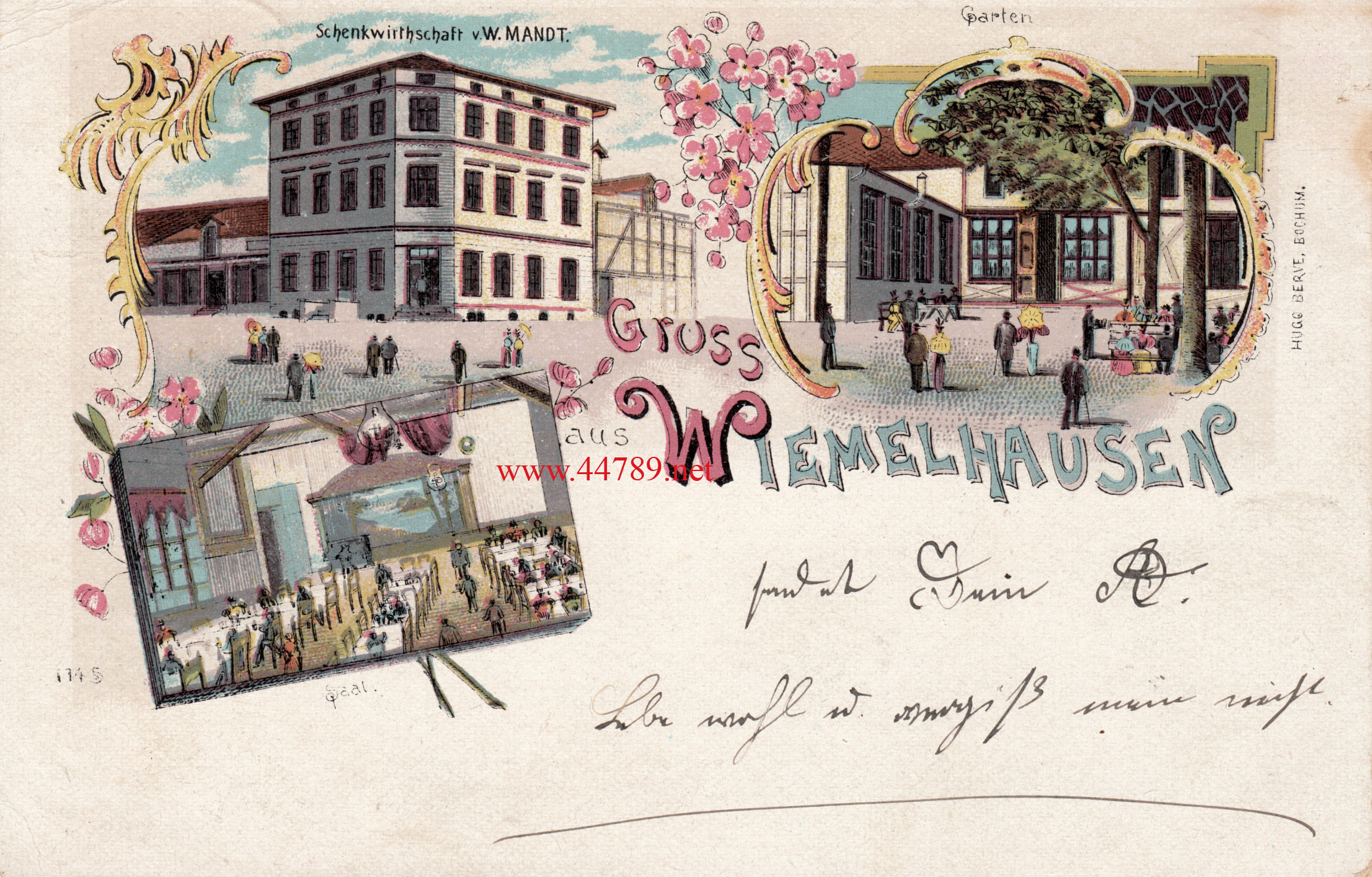 Wiemelhauser Str. 175. Ansichtskarte von 1899. Das Haus befand sich etwa dort, wo die Bahnlinie ("Springorum-") bzw. Waldring (damals noch Waldstraße) die Wiemelhauser Straße querte. Heute total verändert durch "Tieferlegung" der Uni-Str. mit Brückenbau. (Foto noch größer sehen - hier klicken!) |