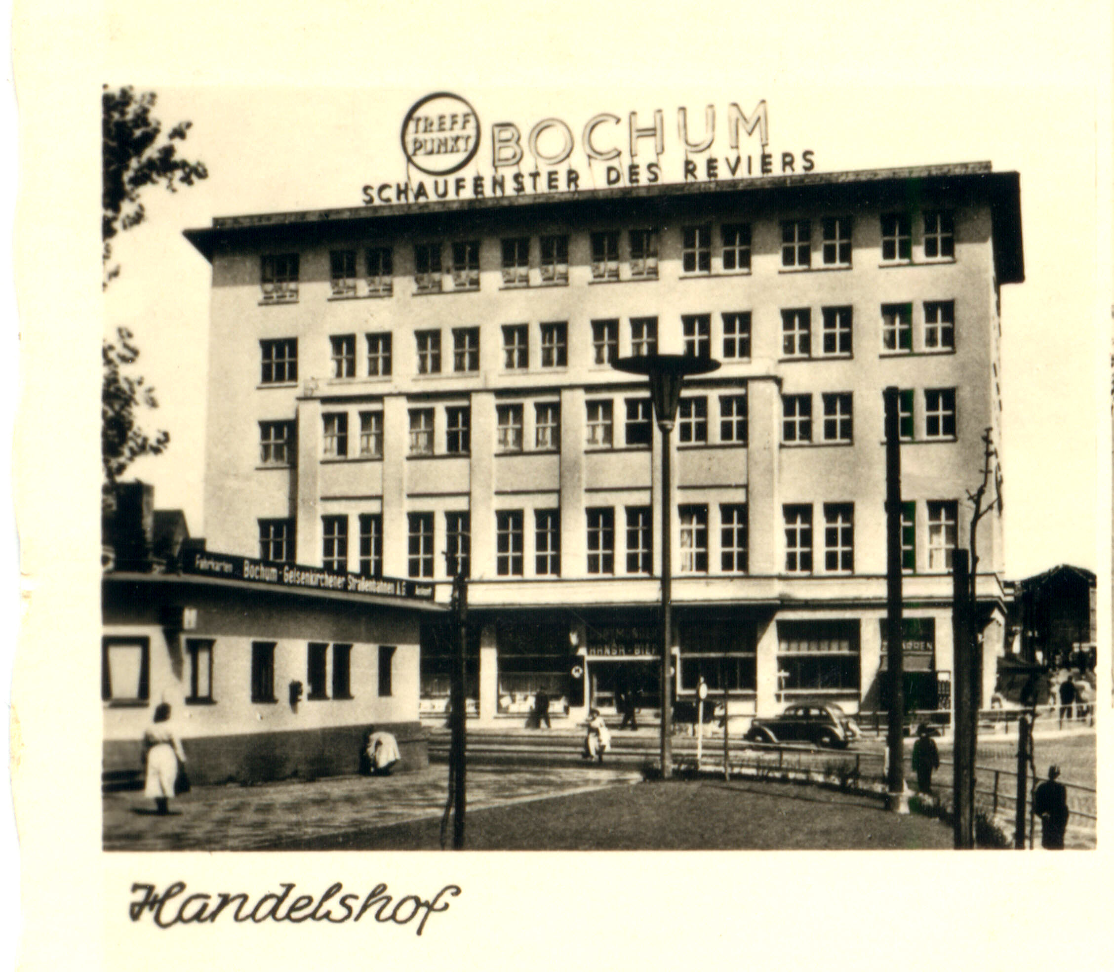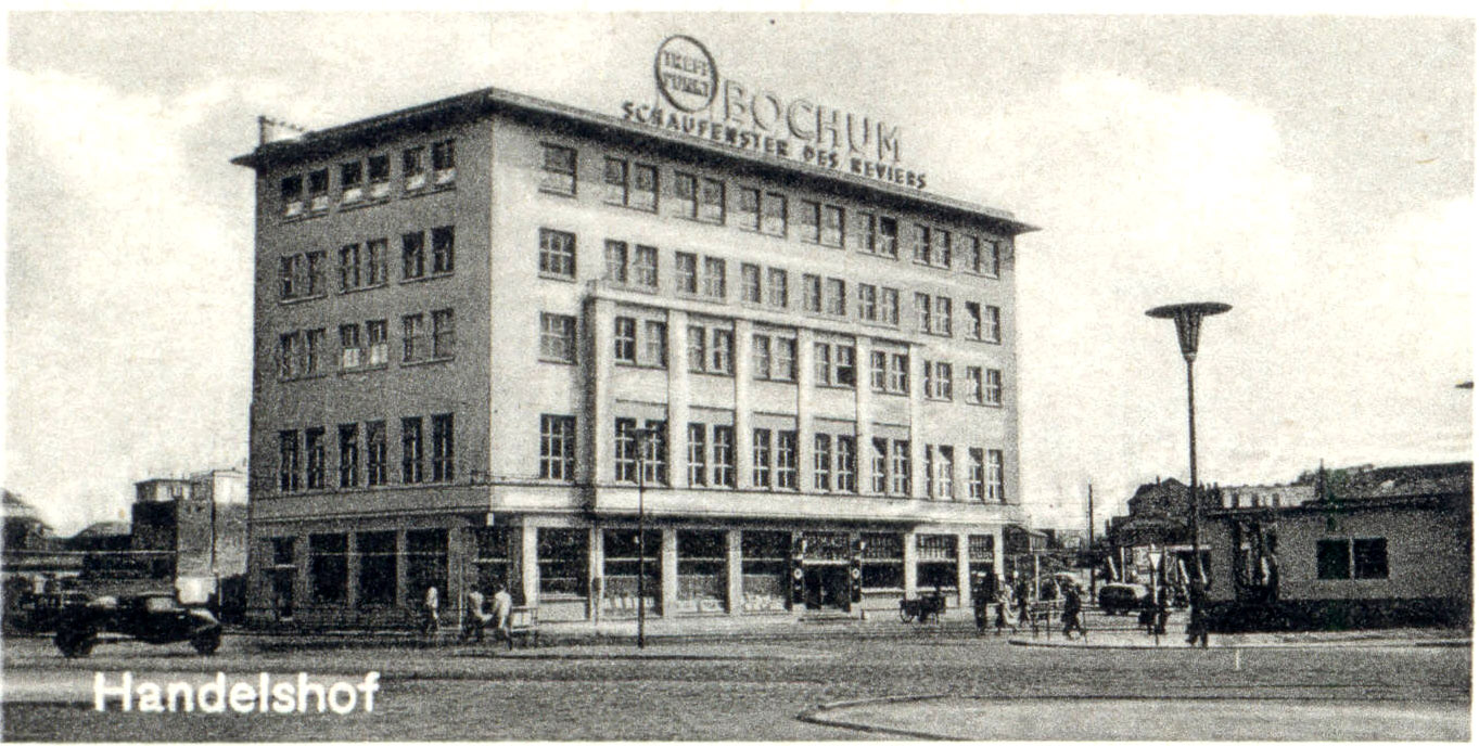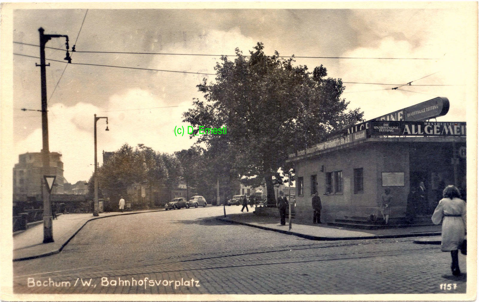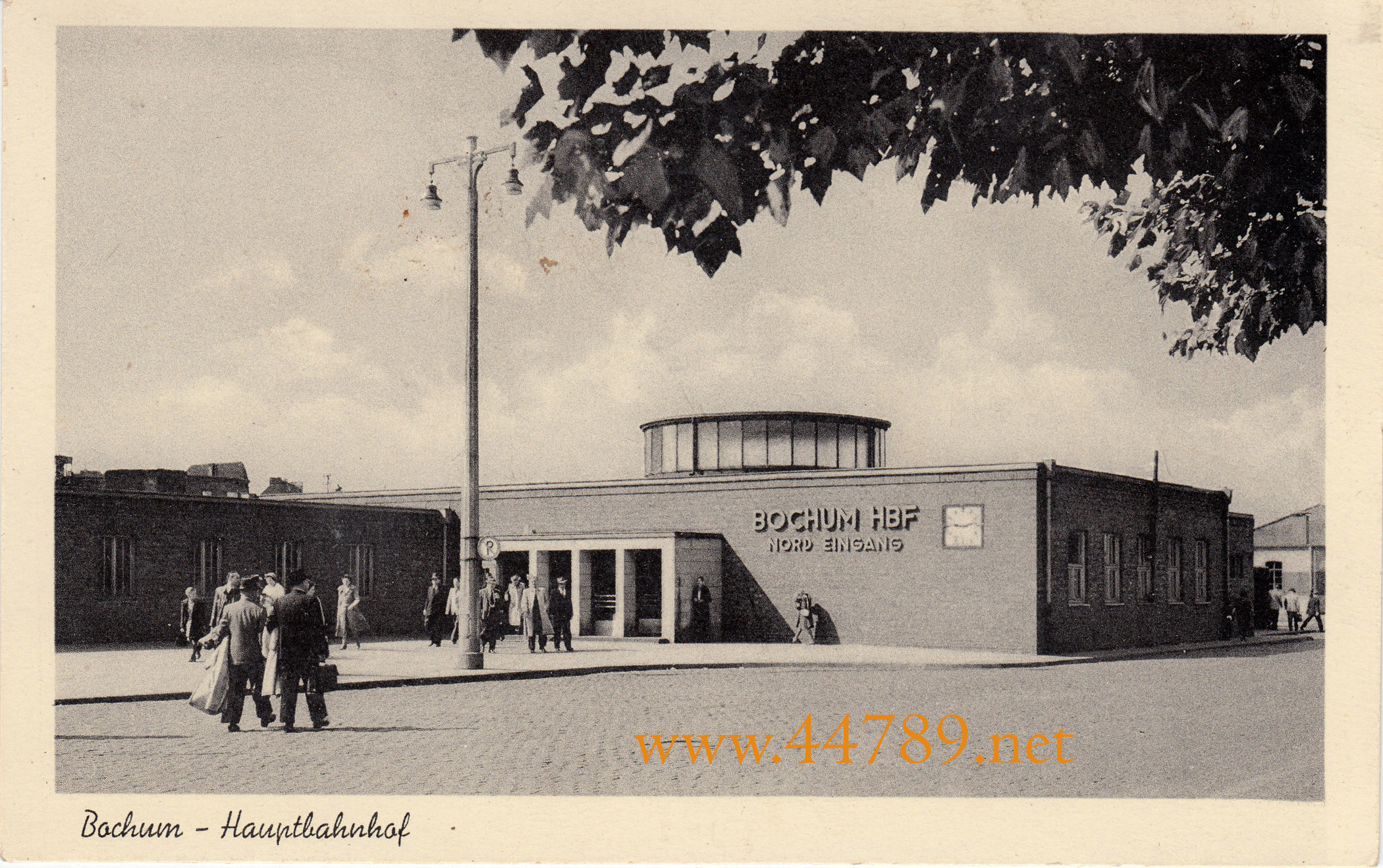 Ansichtskarte von 1953. Zwar nicht mehr zum Ehrenfeld gehörend - aber wer hier mit der Bahn ankam, gelangte nach wenigen Metern - durch die 'Mausefalle' schreitend - sofort ins Ehrenfeld. Der neue Bochumer HbF wurde 1957 an heutiger Stelle eröffnet. Dieses Gebäude wurde 1949 auch unter dem Namen "Katholikentagsbahnhof" bekannt, da die Besucher des Katholikentags in Bochum, die per Eisenbahn kamen, hier überwiegend eintrafen. |