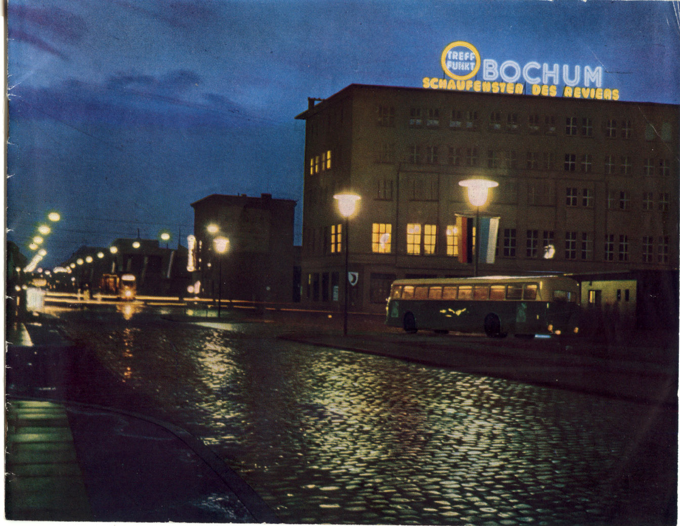 Ansichtskarte von 1956. An dieser Stelle befindet sich heute der Anfang der Kneipenmeile "Bermuda Dreieck", auf dem Foto links erkennt man die Häuser der Hattinger Str., heute Alte Hattinger Straße. (Foto noch größer sehen - hier klicken!) |