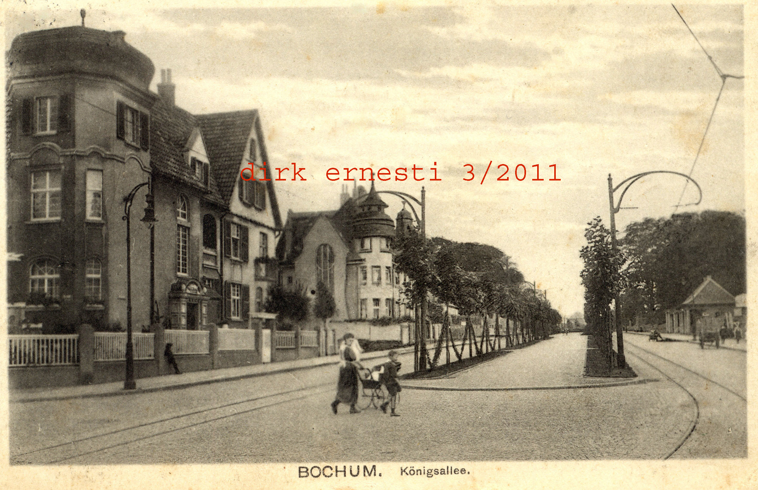 (Foto; als Postkarte hergestellt, Unikat!) Eckhaus Christstraße (links), Königsallee. Das Haus rechts (Ecke Hugo-Schultz-) hat einen sehr markanten Turm - vgl. Foto unterhalb - das Haus links ist verändert (um eine Etage "gekürzt") erhalten. (Foto noch größer sehen: - hier klicken!) |