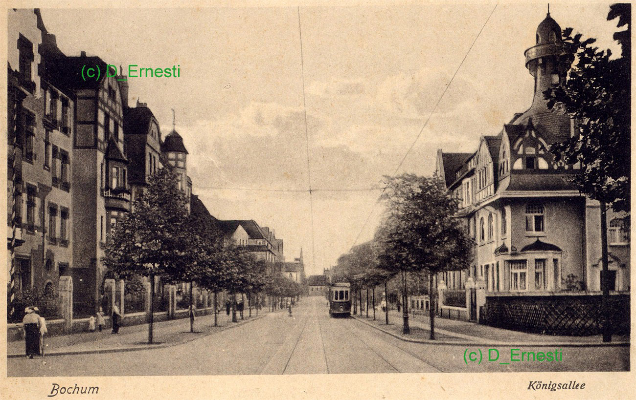 hier gesehen von der noch überwiegend unbebauten, östlichen Seite der Hugo-Schultz-Straße über die Königsallee hinweg. Der Häuserblock bildet mit dem noch erhaltenen Teil im Bereich Christstraße-Pieperstraße ein Viereck, Bauherr war der Gemeinnützige Wohnungsverein zu Bochum eG. (Foto noch größer sehen: - hier klicken!) |