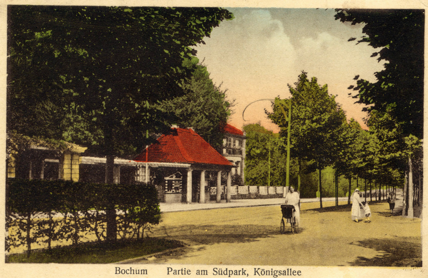 Auf einer kolorierten Karte, 1921 hergestellt. Gesehen in Richtung Innenstadt, auf Höhe der Einmündung in die Grünstraße (heute Arnikastraße) - rechts. Links das Parkwärter-Häuschen am Südpark mit Eingang in den Park. (Foto noch größer sehen: - hier klicken!) |