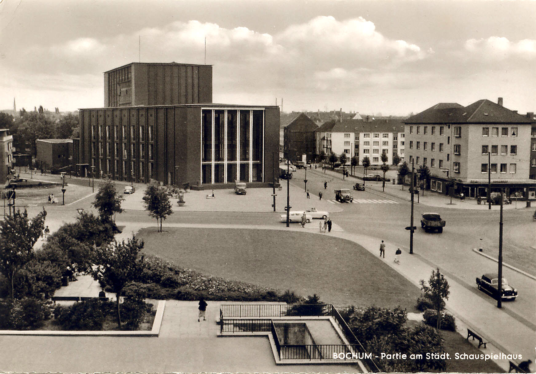 Die Grünfläche im Vordergrund gehört zum Westfalenplatz, man sieht die Kreuzung Königsallee/Hattinger- /Oskar-Hoffmann-Straße und das Schauspielhaus, ferner die helle Häuserzeile an der Hubertusstraße mit dem seinerzeit noch als Parkplatz genutzten William-Shakespeare-Platz. (heutige Benennung) (Foto noch größer sehen - hier klicken!) |