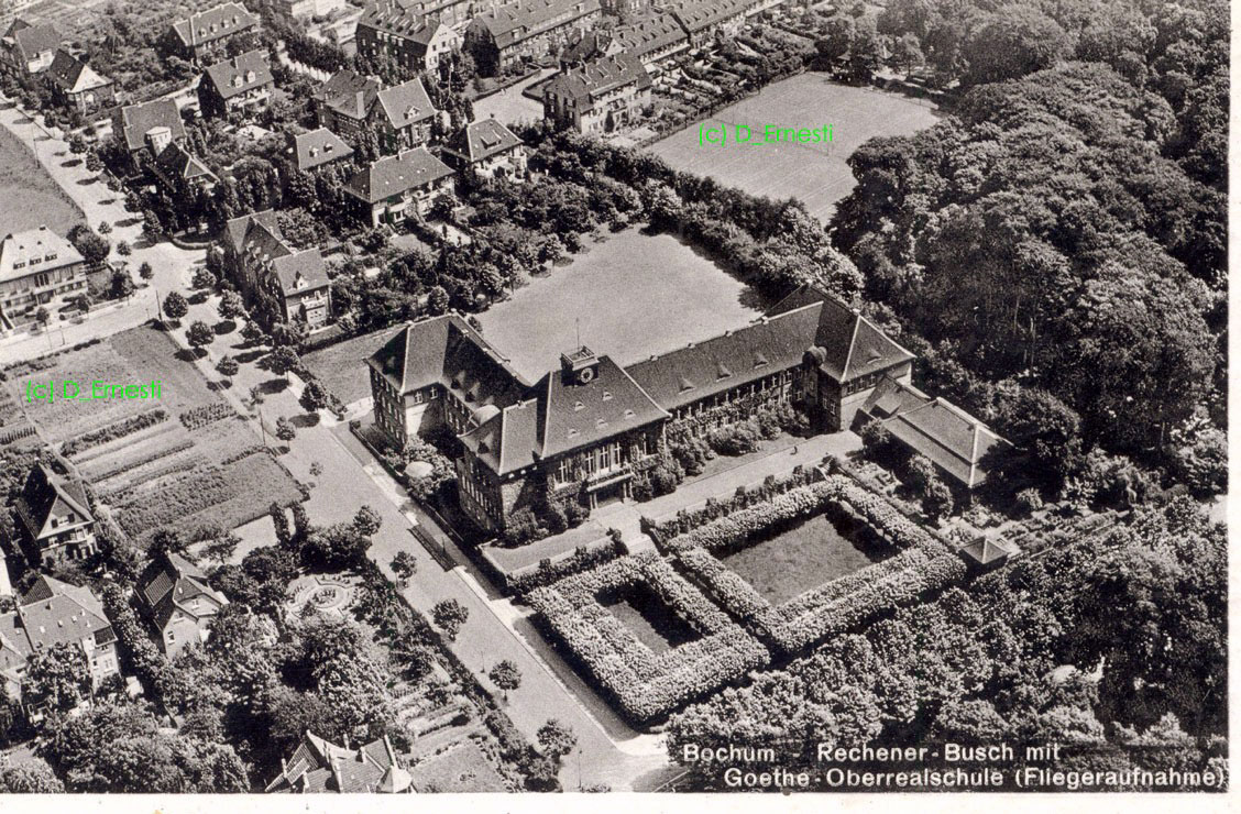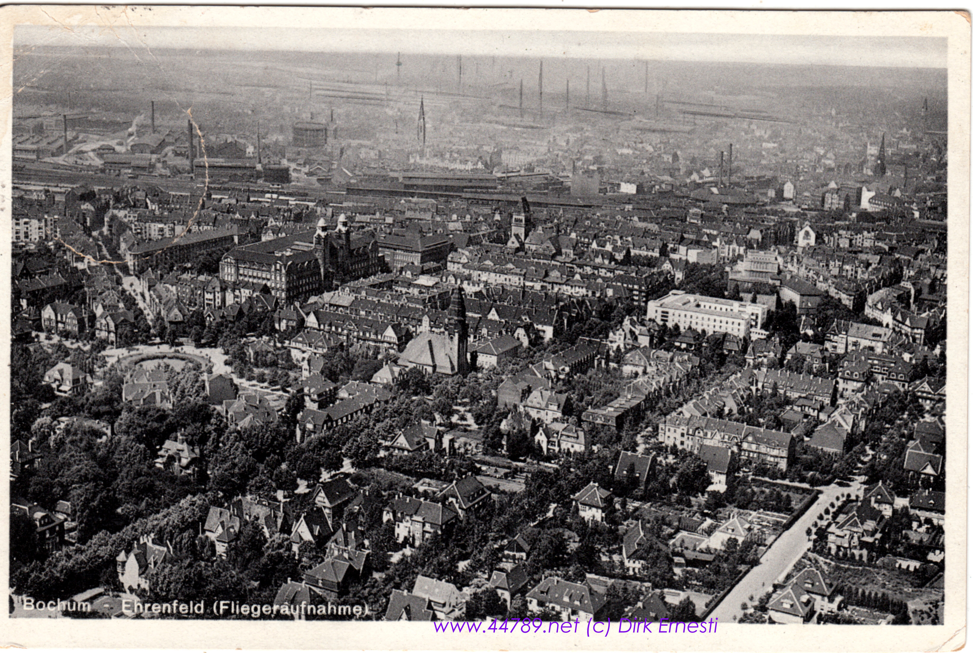 aus der Luft. (Postkarte v. 1960) Blickrichtung Norden, mit Innenstadt. Im Vordergrund ganz unten rechts der Sportplatz der Friederika-Grundschule, man sieht ferner die Dr.-C-Otto-Verwaltung, das Schauspielhaus, das (heutige) Finanzamt BO-Süd, die Melanchthonkirche und vieles mehr. Am unteren Bildrand verläuft in horizontaler Richtung die Friederikastraße. (Foto noch größer sehen - hier klicken!) |