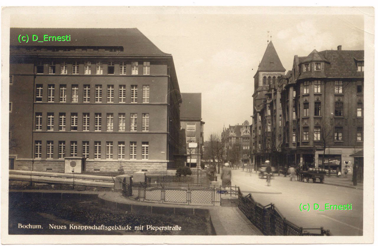Auf einer Fotokarte, mit schriftl. Notiz von 1955. gesehen von der Königsallee. Links Gebäude in der Pieperstraße, Nebengebäude vom Knappschaftserweiterungsbau. (Foto noch größer sehen - hier klicken!) |