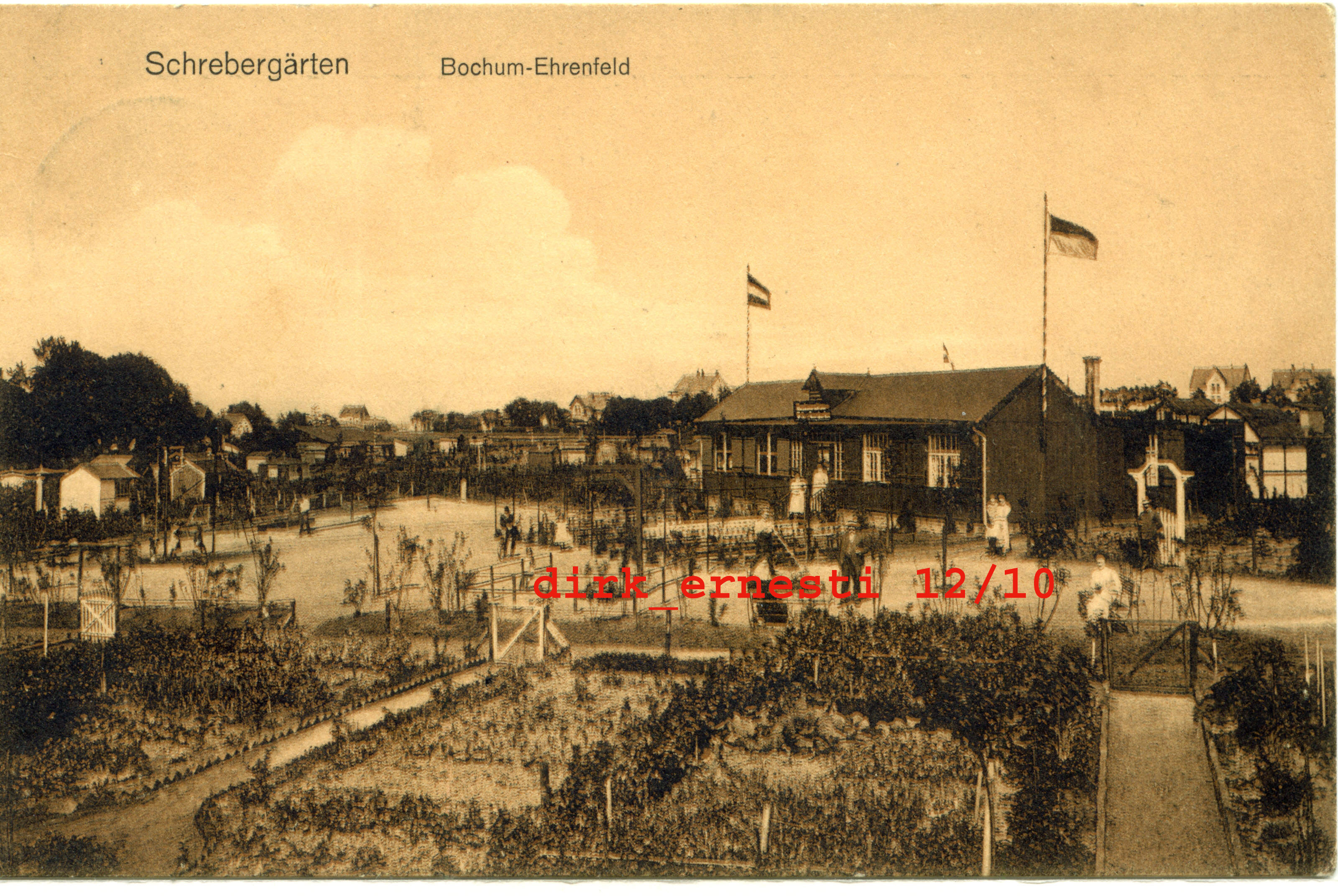 Postkarte, verwendet 6/1911 Zeigt einige Gärten, in Bildmitte offenbar das Vereinsheim des KgV Ehrenfeld, die Anlage bestand zum Zeitpunkt der Aufnahme gerade 3 Jahre. Im Hintergrund sieht man Häuser in der Wiemelhauser Straße, heute verkehrsberuhigter Bereich. (Foto noch größer sehen - klicken!) |