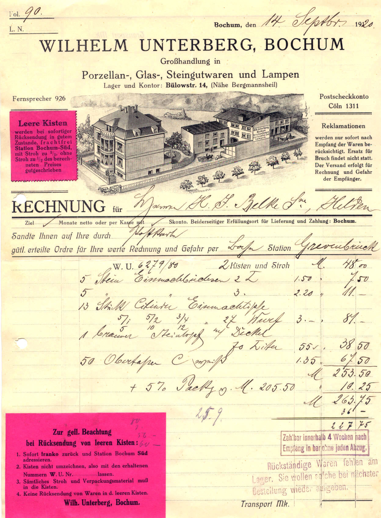 (von einer Rechnung, benutzt 1920) Das Gebäude befand sich in der Bülowstraße (Gilsingstr.) 14, nahe der Hattinger Straße. Auf dem Nebengrundstück, das ähnlich geschnitten war, befand sich von den 1950er bis in die 1980er Jahre die Firma Wohntextil Fritz Max Weiser (Haus Nr. 16) (Bild noch größer sehen - klicken!) |