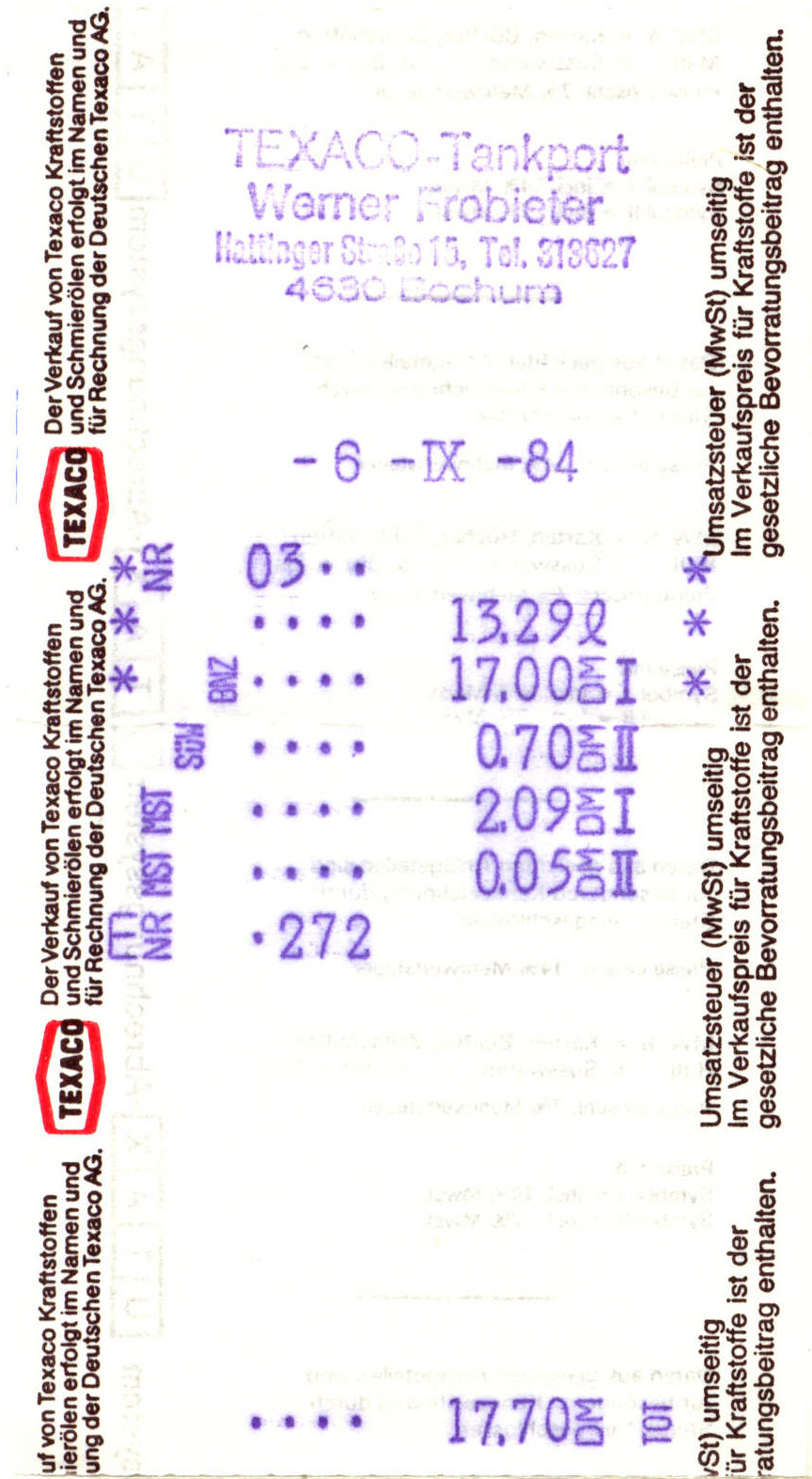 (von 1984) damals befand sich an der Stelle, wo heute die Fa. Silicon Computer ist, eine Texaco-Tankstelle, betrieben von Werner Frobieter. Die Hausnummer wurde offenbar geändert, heute wäre es Nr. 48. Interessantes Detail: Benzin kostete seinerzeit noch um 1,30 DM/l :-) (Groß ansehen - klicken!) |