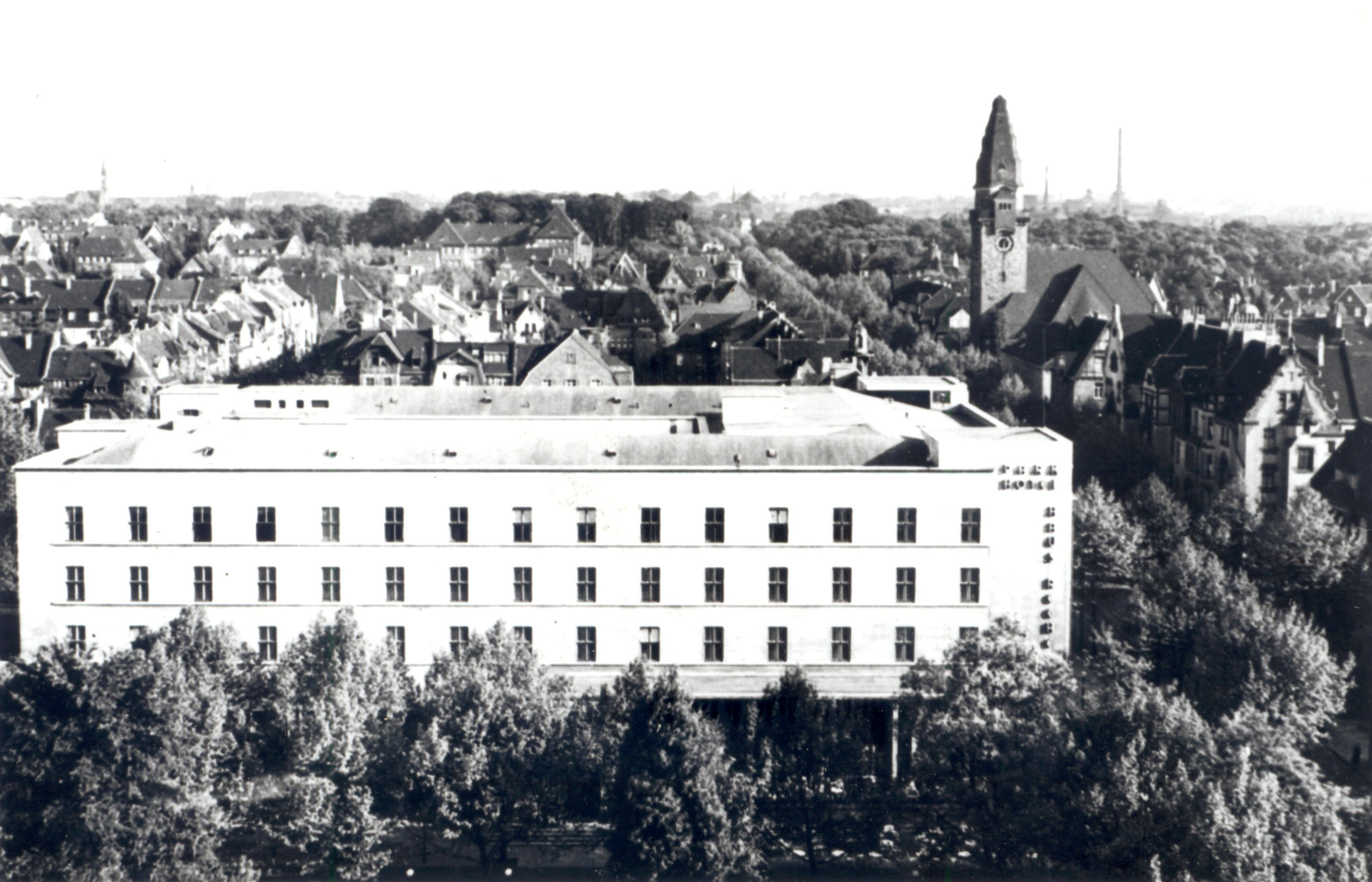 Auf einer Werbepostkarte, benutzt 1932. Oben links das Stadttheater, vorne links Häuser in der Weiherstraße, oben rechts Ecke Fürstenstr./Ewaldstraße. Hier haben einige Häuser den Krieg unzerstört überstanden. (Foto noch größer sehen - hier klicken!) |