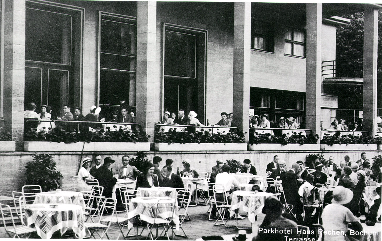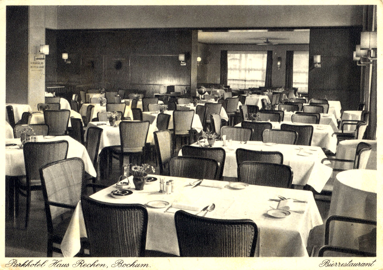 Ansichtskarte, gelaufen 1938. Gedeckte Tische in gediegender Atmosphähre, auf diesem Bild kommt das gehobene Flair im Parkhotel Haus Rechen gut herüber. (Foto noch größer sehen - hier klicken!) |