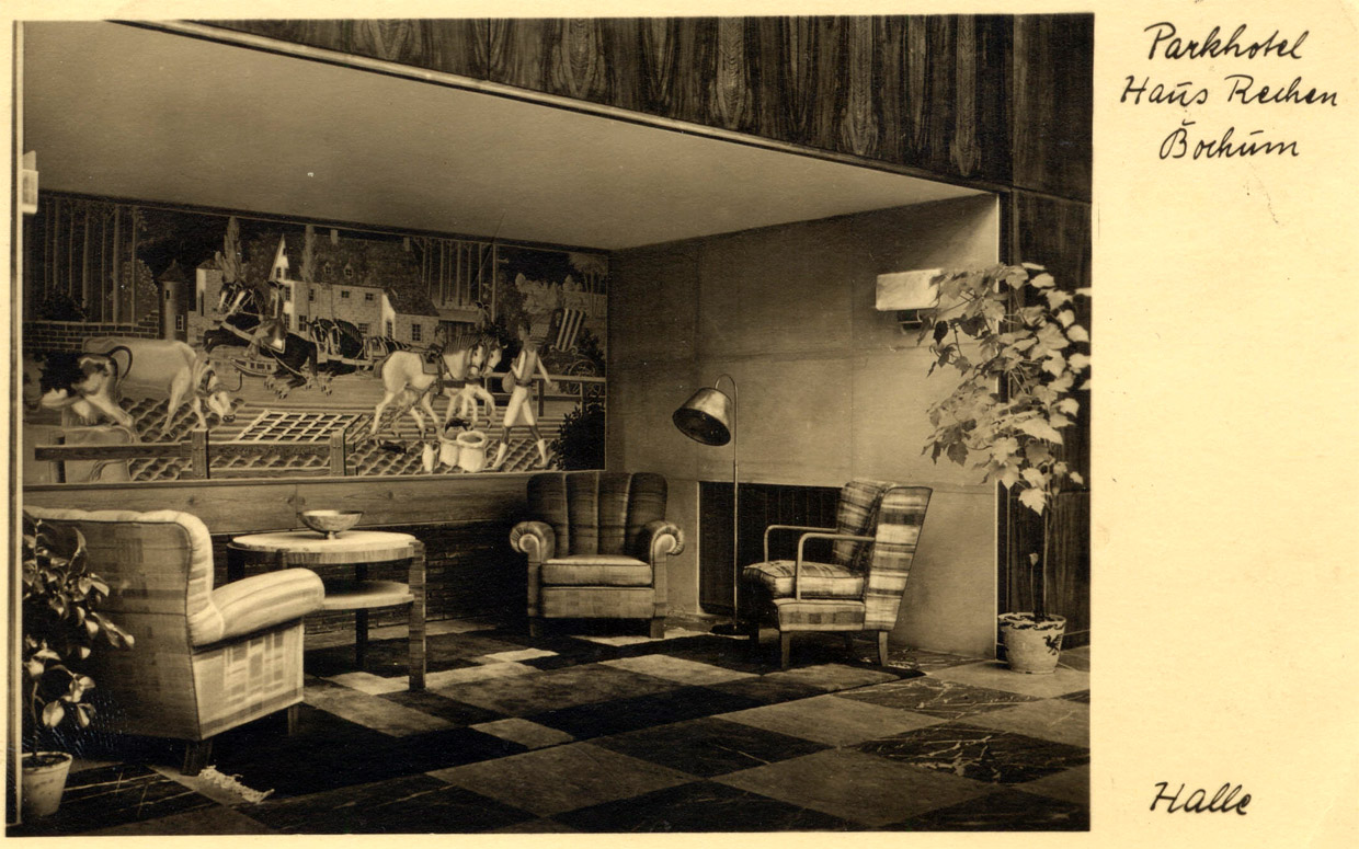 Man sieht eine Sitzgruppe vor großer Wandkunst. Von einer Postkarte, verwendet 1936. (Foto noch größer sehen - hier klicken!) |
