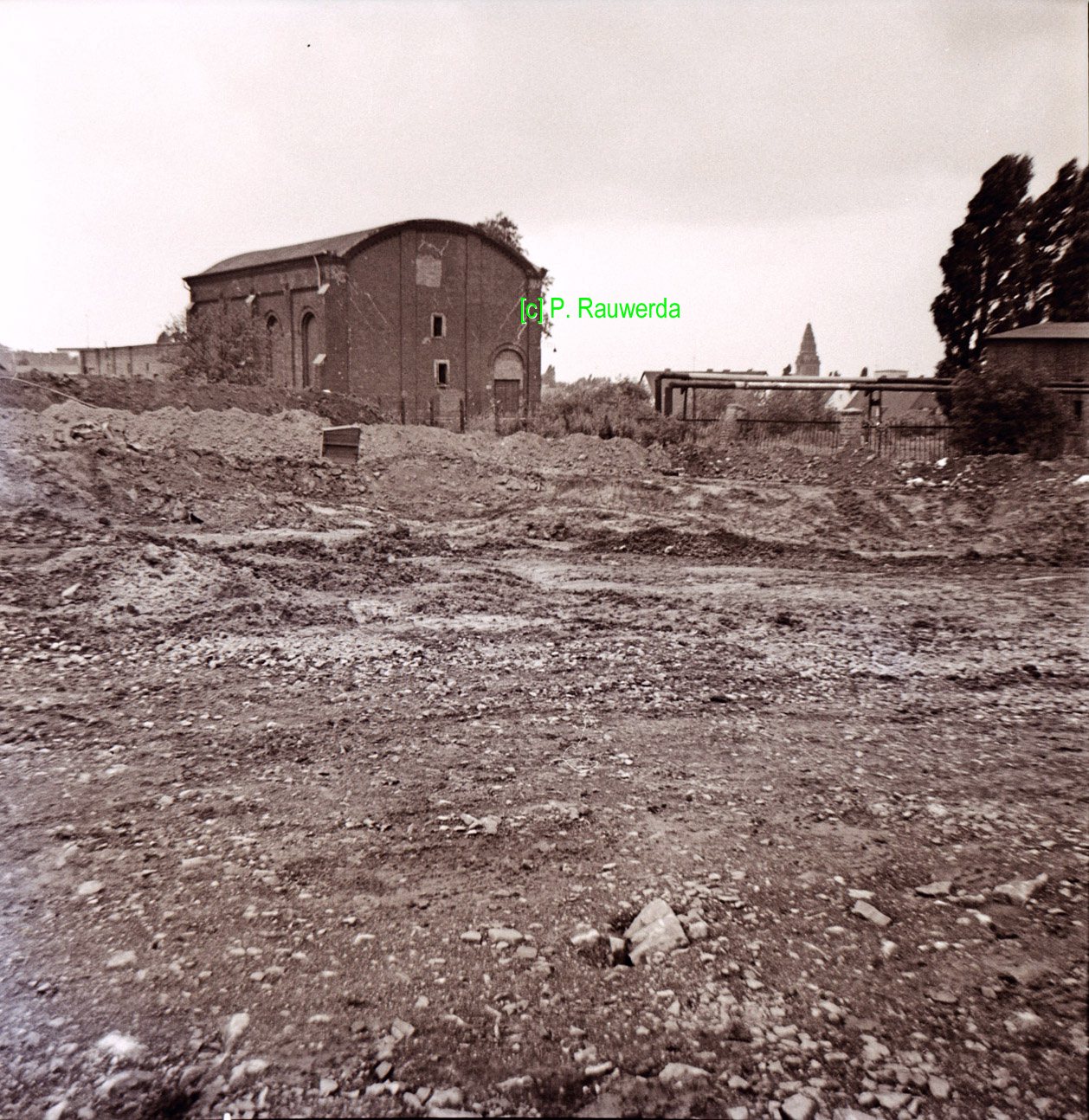 (Foto von 1966) Gesehen von Osten, dahinter ein Flachdachgebäude zur Fernwärme-Nebengewinnung. In den Jahren um 1970/75 war es ein beliebter 'Sport' für uns Kinder, in das Gebäude zu klettern und in der verfallenen Industriekulisse zu spielen, Einlaß fanden wir an der Stelle, wo auf diesem Foto Treppe und Tür zu sehen sind. An Stelle des Gebäudes befindet sich heute der Neubau der BGW - Berufsgenossenschaft für Gesundheitsdienst und Wohlfahrtspflege, Uni-Straße 78. (Foto noch größer sehen - klicken!) |