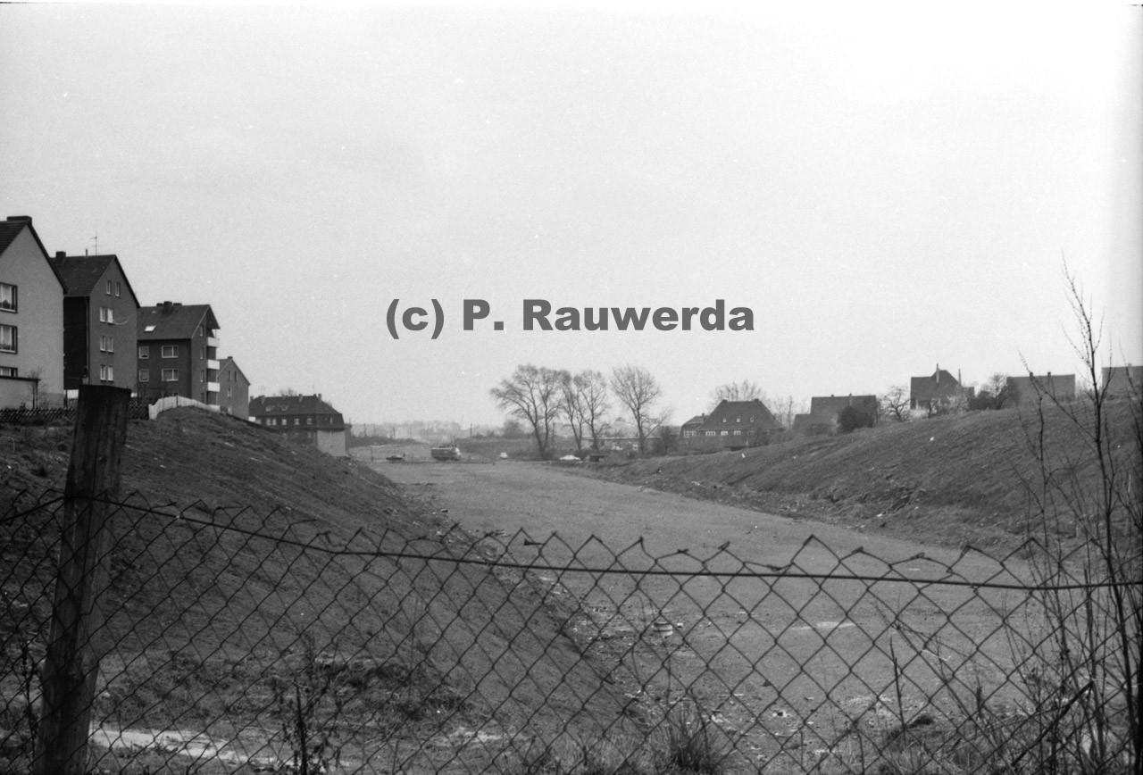 Gesehen von etwa derselben Stelle, wie auf dem Bild oben, diesmal jedoch geht der Blick in Richung Stadt, am linken Bildrand der Turm des Europahochhauses am Bahnhof. Hier kreuzt von links nach rechts - im Schlamm teilweise nicht zu erkennen - die Eisenbahnlinie Weitmar - Bochum-Nord die ehemalige Wiemelhauser Straße, rechts ein Warnkreuz. Die beiden Gebäude am rechten Bildrand liegen heute am Rand der Böschung oberhalb der Trassenführung Unistraße. (früher: Bleiwerke) (Foto noch größer sehen - klicken!) |