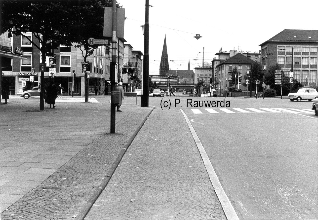 (Aufnahme vom Mai 1965) Gesehen stadtauswärts, hinten die Bahnunterführung, danach beginnt die Könisgallee. Seinerzeit fuhr hier noch die BoGeStra Straßenbahn der Linie 8. Am linken Bildrand befindet sich heute der Biergarten des 'Mandragora' am Konrad-Adenauer-Platz (KAP) (Foto noch größer sehen - klicken!) |