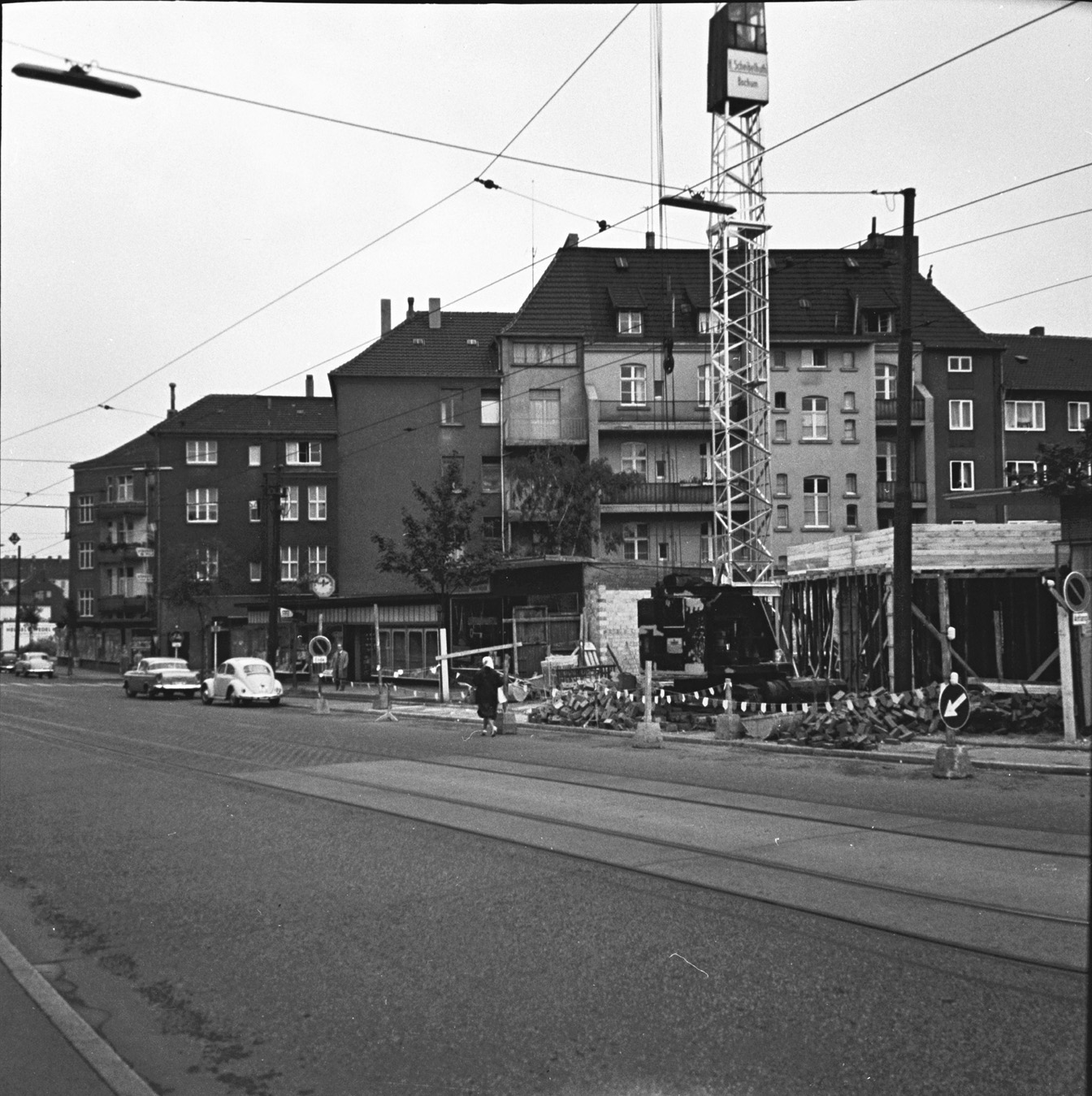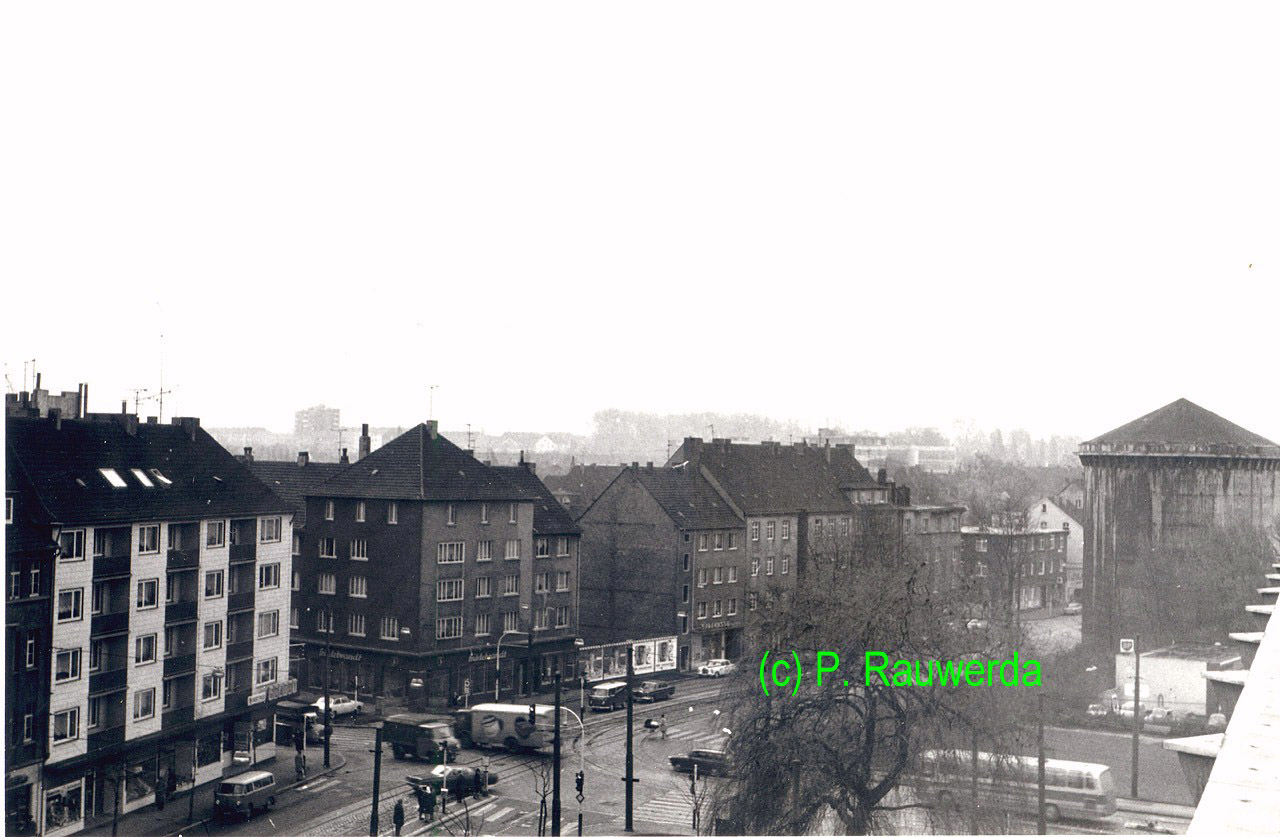 Gesehen vom Verwaltungsbau der BoGeStra, rechts der Bunker, im linken Bilddrittel das Eckgebäude mit dem Geschäft "Reitsportbedarf Hildebrandt", die Straßenführung wurde hier nach 1972 mit Umbenennung der Wiemelhauser Str. in Universitätsstraße stark verändert (die stadtauswärts führende Fahrspur führt seitdem rechts um den Bunker herum) (Foto noch größer sehen - klicken!) |