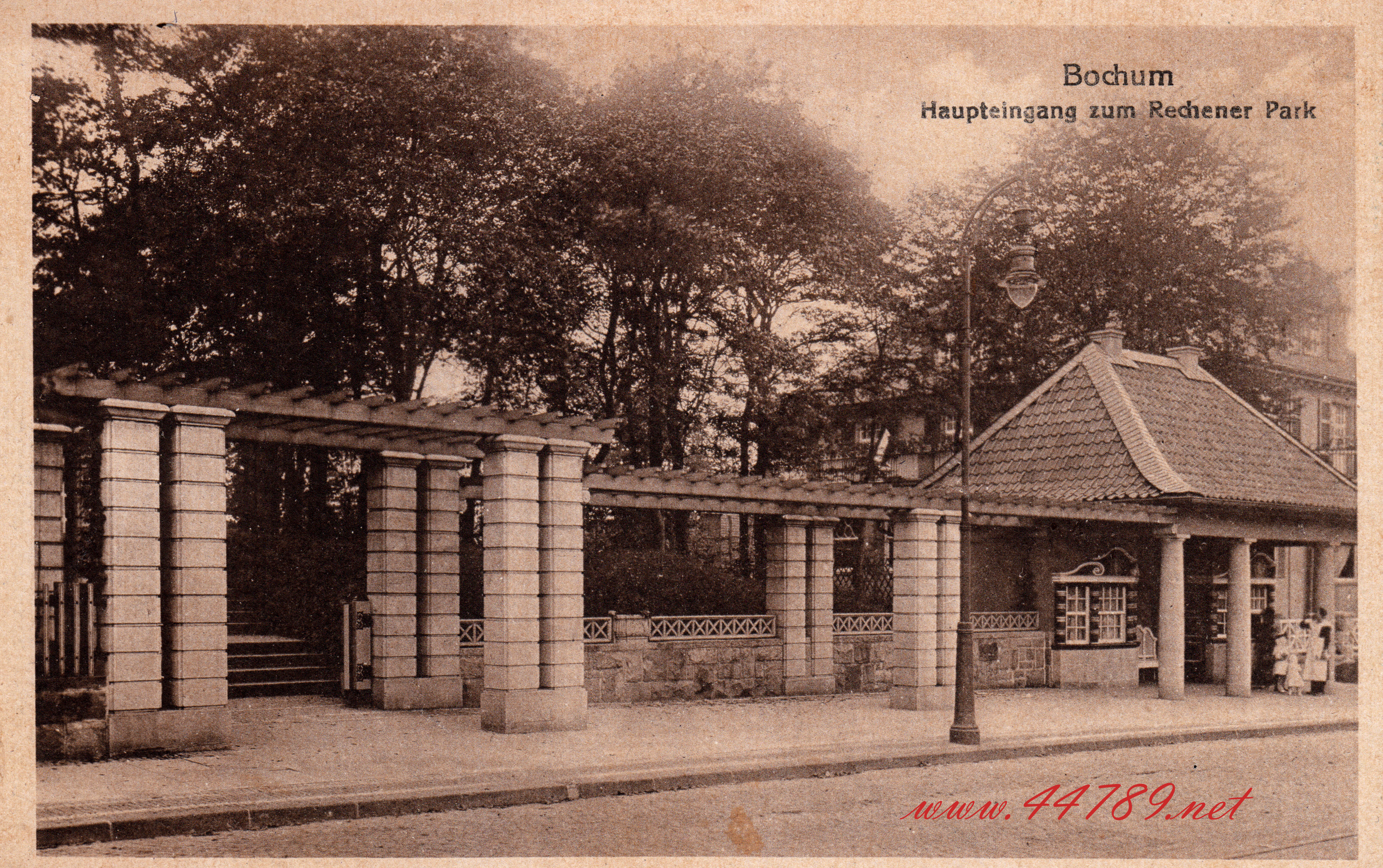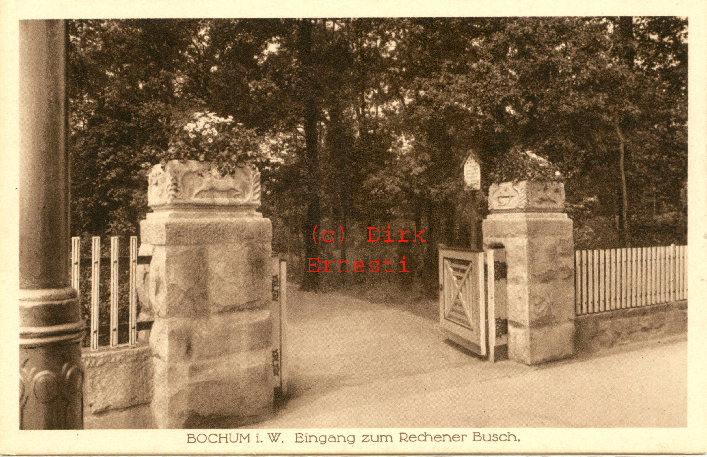 am Haupteingang zum Rechener Busch. Vorne die Königsallee, stadtauswärts führende Seite. (aus der Sammlung von Eberhard Brand) Ansichtskarte um 1920. (Foto noch größer sehen - hier klicken!) |