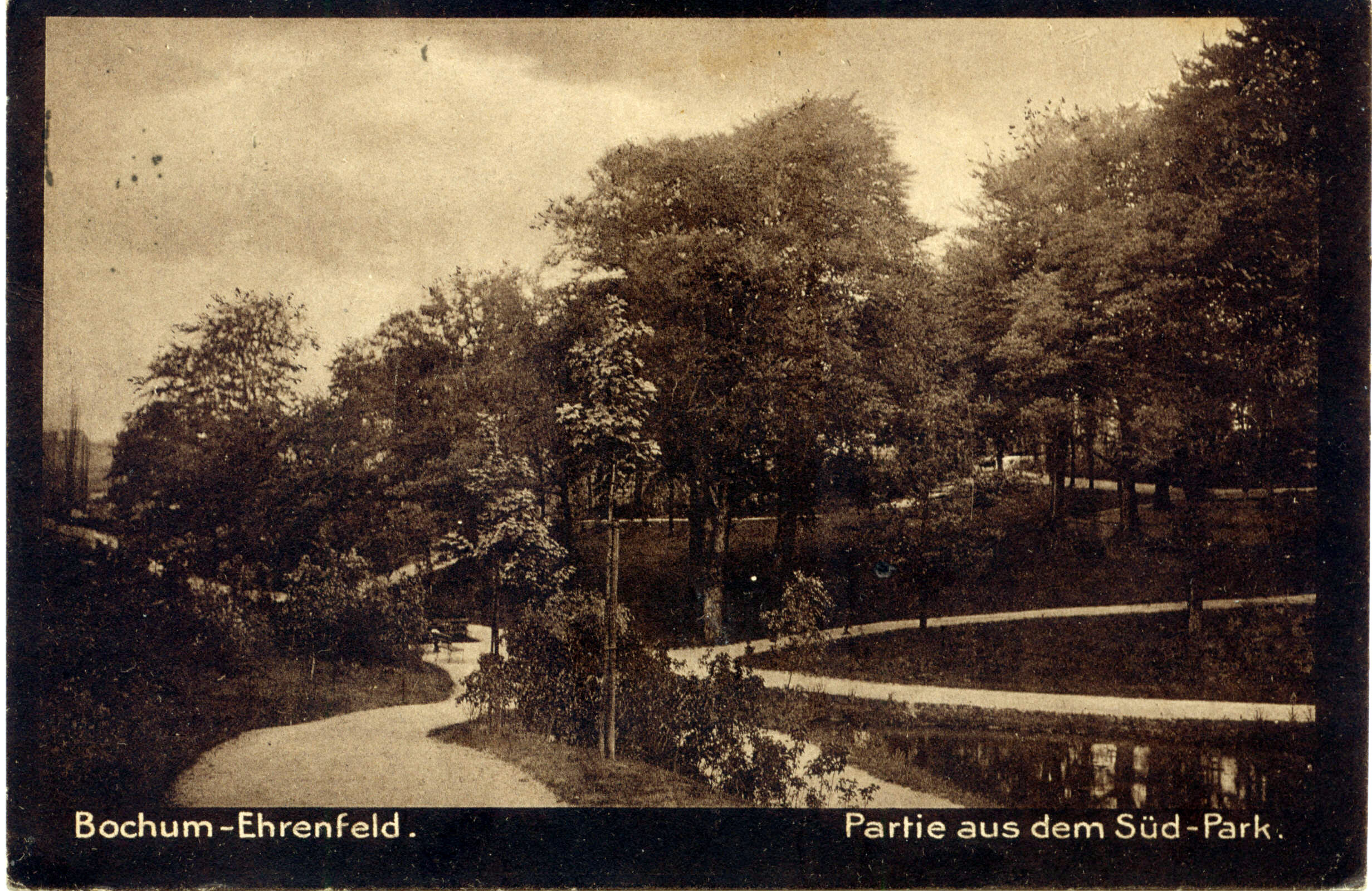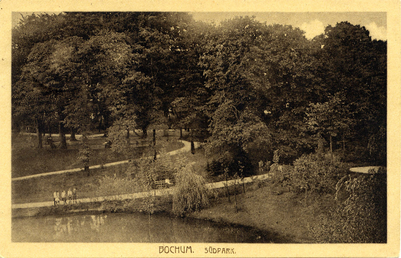 auf einer Postkarte von 1921. hier der westliche Parkteil nahe der (später angelegten) Marschner Straße/Hunscheidtstraße - damals gabs hier noch einen kleinen Teich, der heute leider versiegt ist (siehe ähnl. Ansichten weiter unten) (Foto noch größer sehen - hier klicken!) |