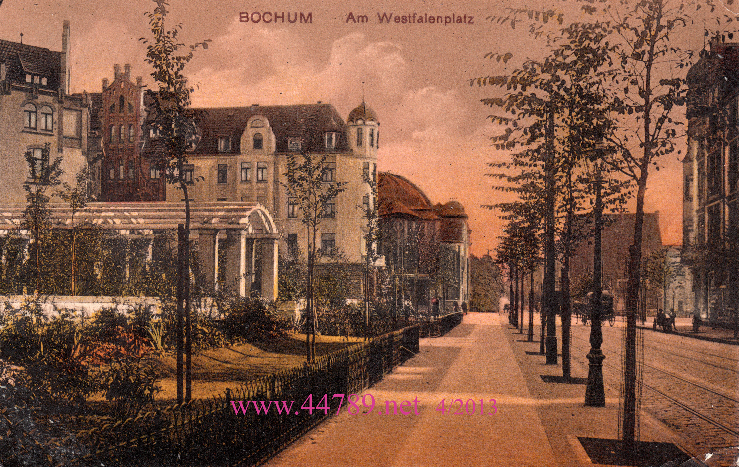Ansichtskarte von 1920. Eine ähnliche Perspektive, wie auf der Karte zu vor. Im Vordergrund sieht man das Dach eines Häuschen, vermutlich Wartebereich für Straßenbahnfahrgäste oder ein Verweilbereich für die kleine Grünanlage am Westfalenplatu. (Foto noch größer sehen - hier klicken!) |
