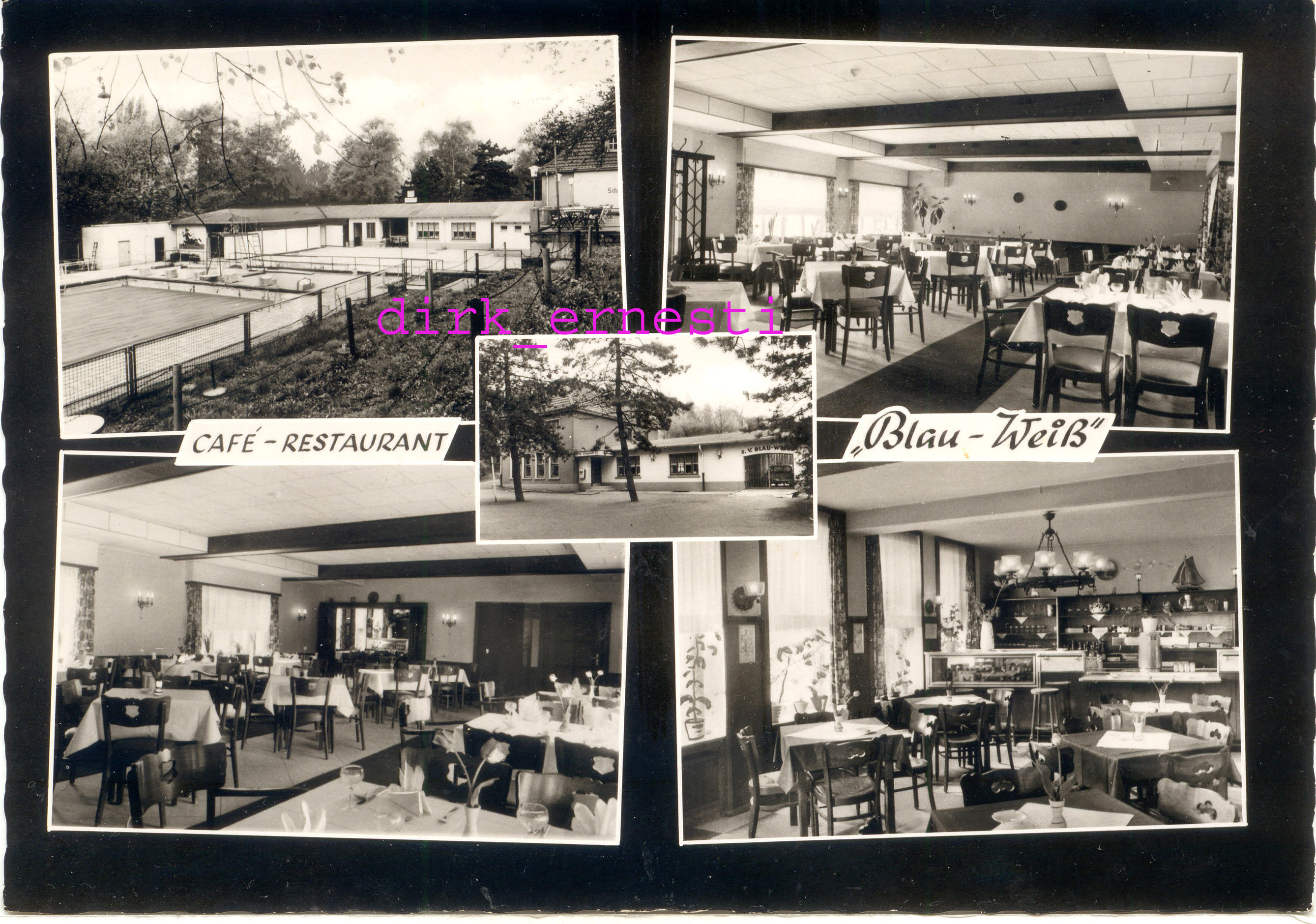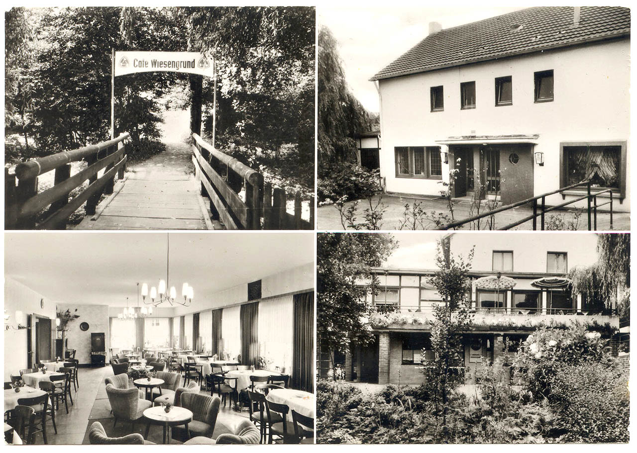 Mehrbild-Ansichtskarte, um 1960. zeigt das ehemalige Café-Restaurant (Bes. Fred Gwiasda) am Wiesengrund 18 von innen. Ein Teilbild zeigt das "alte" Bad. (Foto noch größer sehen - hier klicken!) |