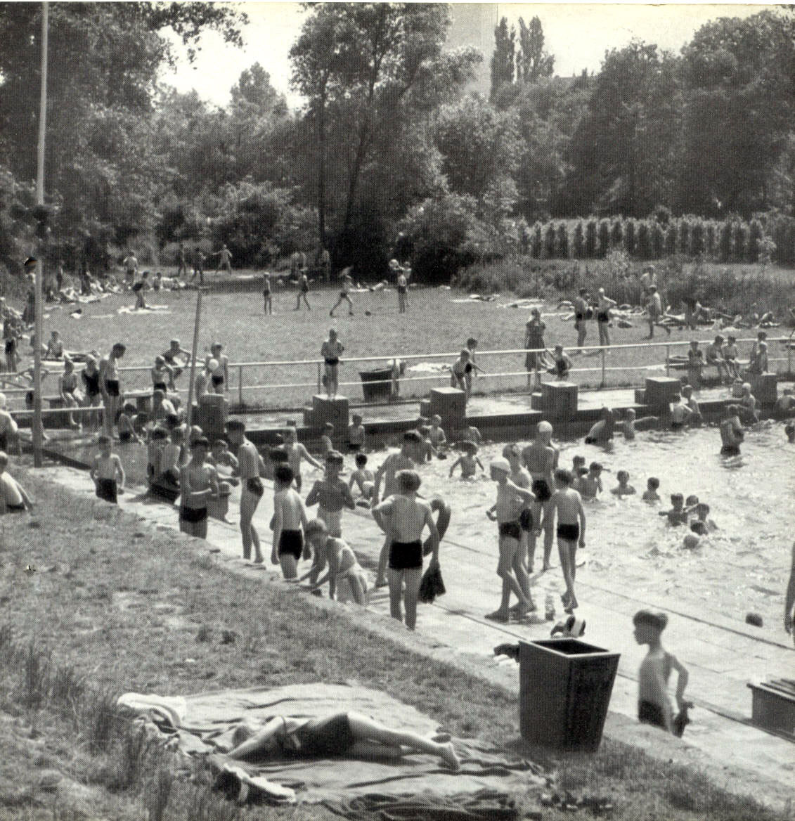 Abbildung aus altem Heimatbuch über Bochum um 1958. Man sieht die Liegewiese, die sich südlich des Beckens anschließt. (Foto noch größer sehen - hier klicken!) |