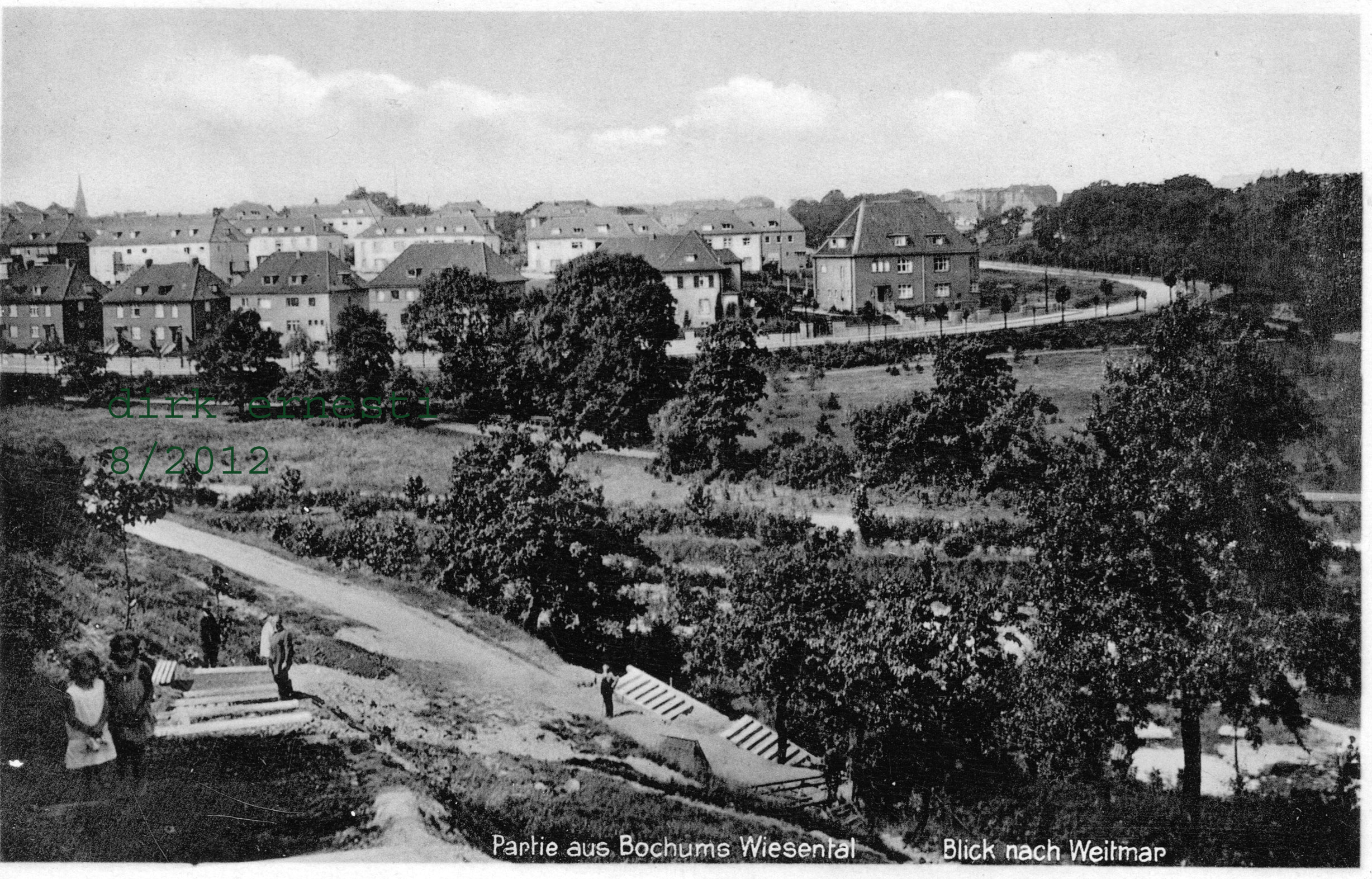 Gesehen über das Tal hinweg, etwa auf Höhe Thorner Straße/Hultschiner Straße. Im Hintergrund sieht man den bogenförmigen Verlauf der Cranachstraße, die schon in Weitmar-Bärendorf liegt. Links ist schwach der Turm von St. Franziskus auszumachen. (Foto noch größer sehen - hier klicken!) |