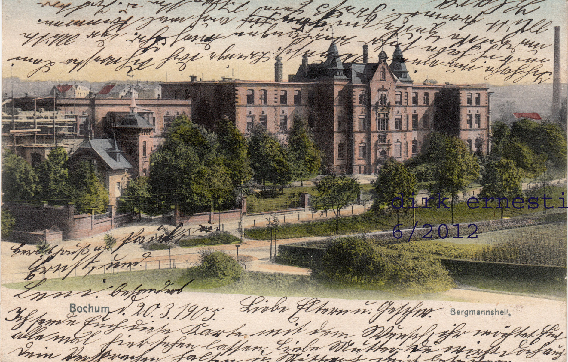 Das Bergmannsheil. Ansichtskarte von 1912. Ähnliche Perspektive, wie Karte oben. Man erkennt gut die noch nicht befestigte Hattinger Straße mit einem Oberleitungsmast für die Straßenbahn nach Weitmar. (Karte größer sehen - hier klicken!) |