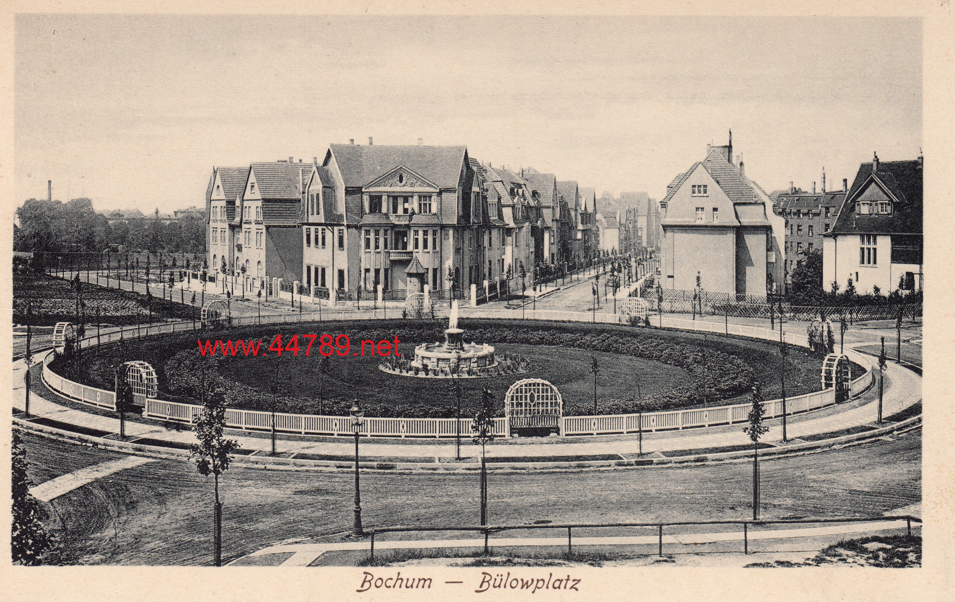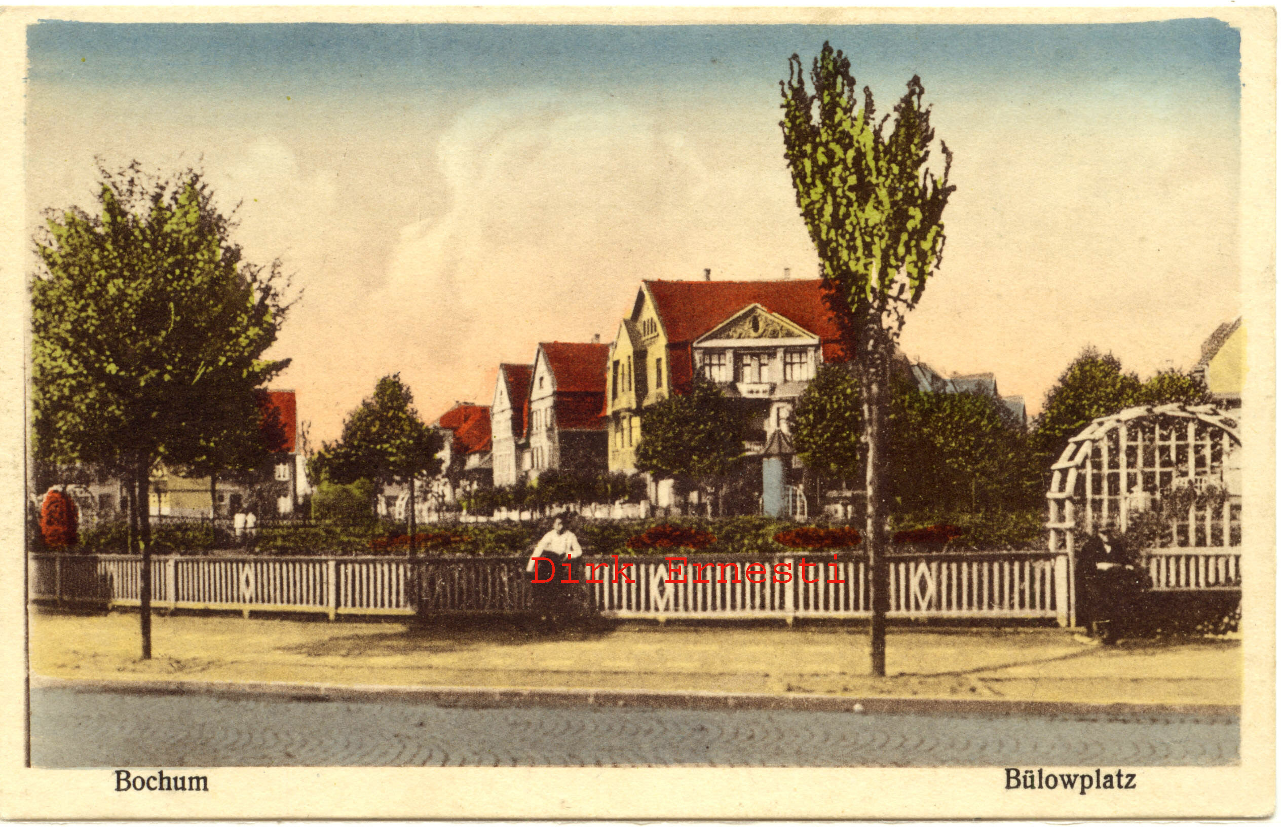 Auf einer kolorierten Ansichtskarte von 1925. Hier wieder ein leicht geänderter Blick, man erkennt rechts die Türme der Knappschaft in der Pieperstraße, links ein Eckhaus in der Bülowstraße (heute Gilsingstraße). (Foto noch größer sehen - hier klicken!) |