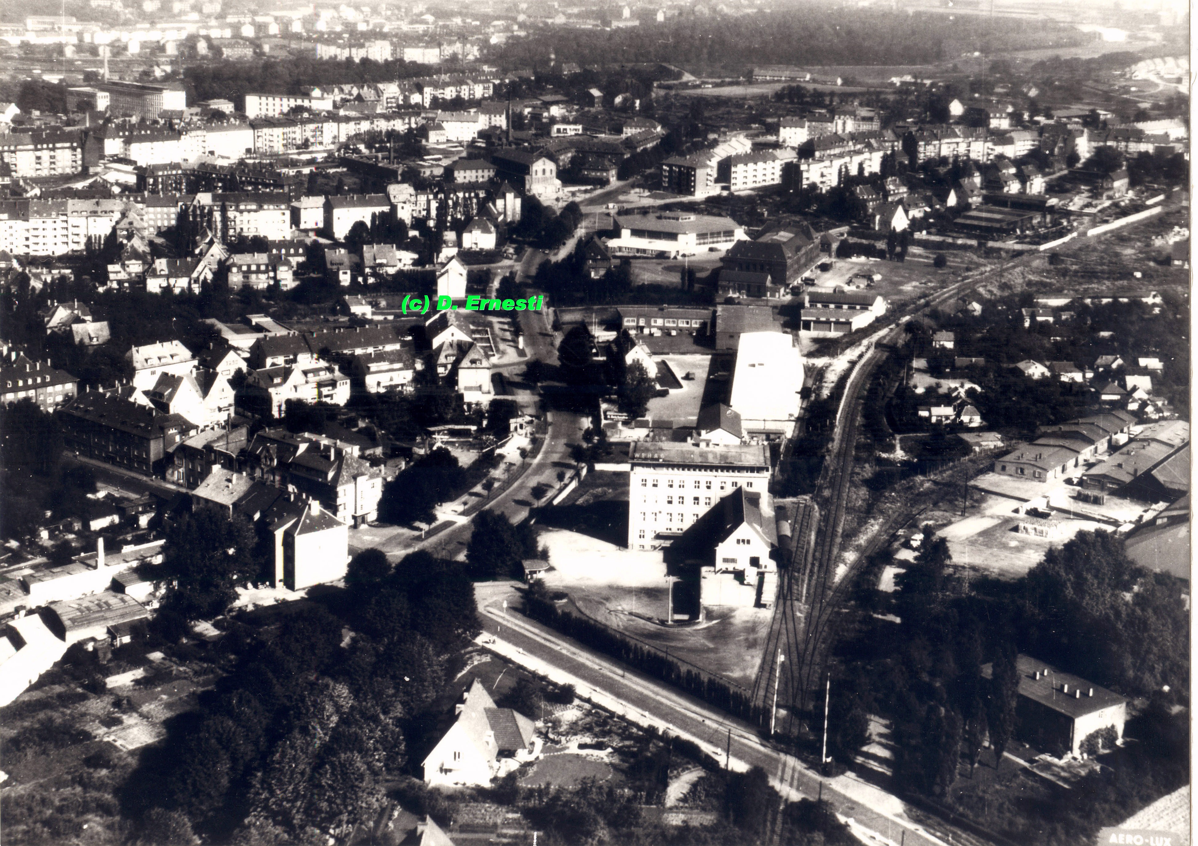 Auf dieser Aufnahme am Bildrand unten zu sehen, oben der HbF mit Europahaus und ganz links die Wagenhalle der BoGeStra. (Foto noch größer sehen - klicken!) Mit freundl. Genehmigung von Ulrich Franzke -Link zur Webseite mit Luftbildern |