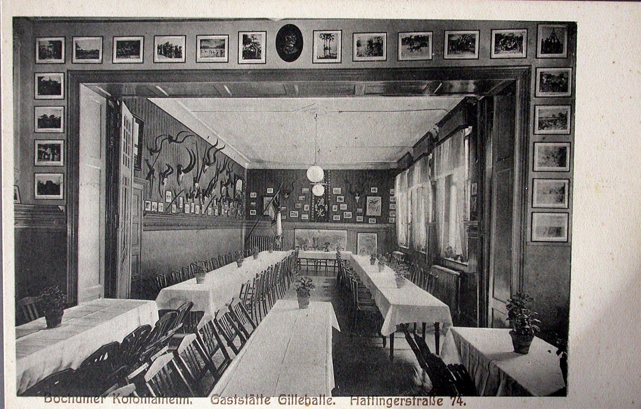(Inhaber Josef B. Strauch). Ansichtskarte, ca 1920. Befand sich in der Hattinger Straße 103, heute (2019) "Schreiners", davor auch als russisches Lokal. Hat sich kaum verändert. (Karte noch größer sehen - hier klicken!) |