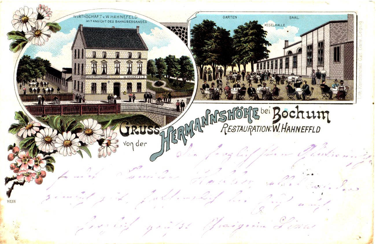 Ansichtskarte von 1898. Das Lokal befand sich an der Hermannshöhe 2, gegenüber der Bahnüberführung, welche die Hermannshöhe mit der Gabelung Neustraße und Rechener Straße im Stadtbereich Bochums verband. Heute befindet sich an dieser Stelle eine Fußgängerunterführung. (Karte noch größer sehen - hier klicken!) |