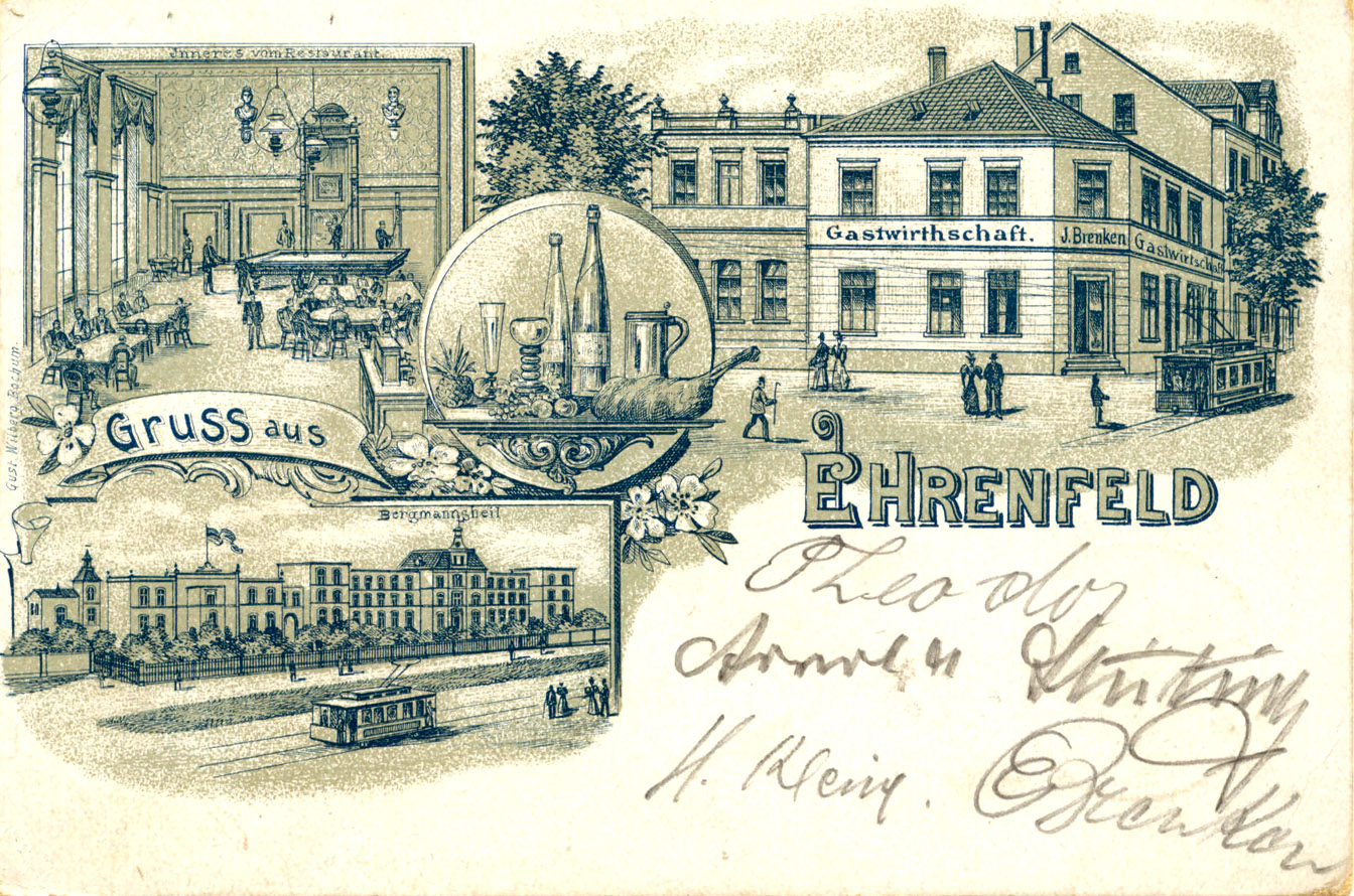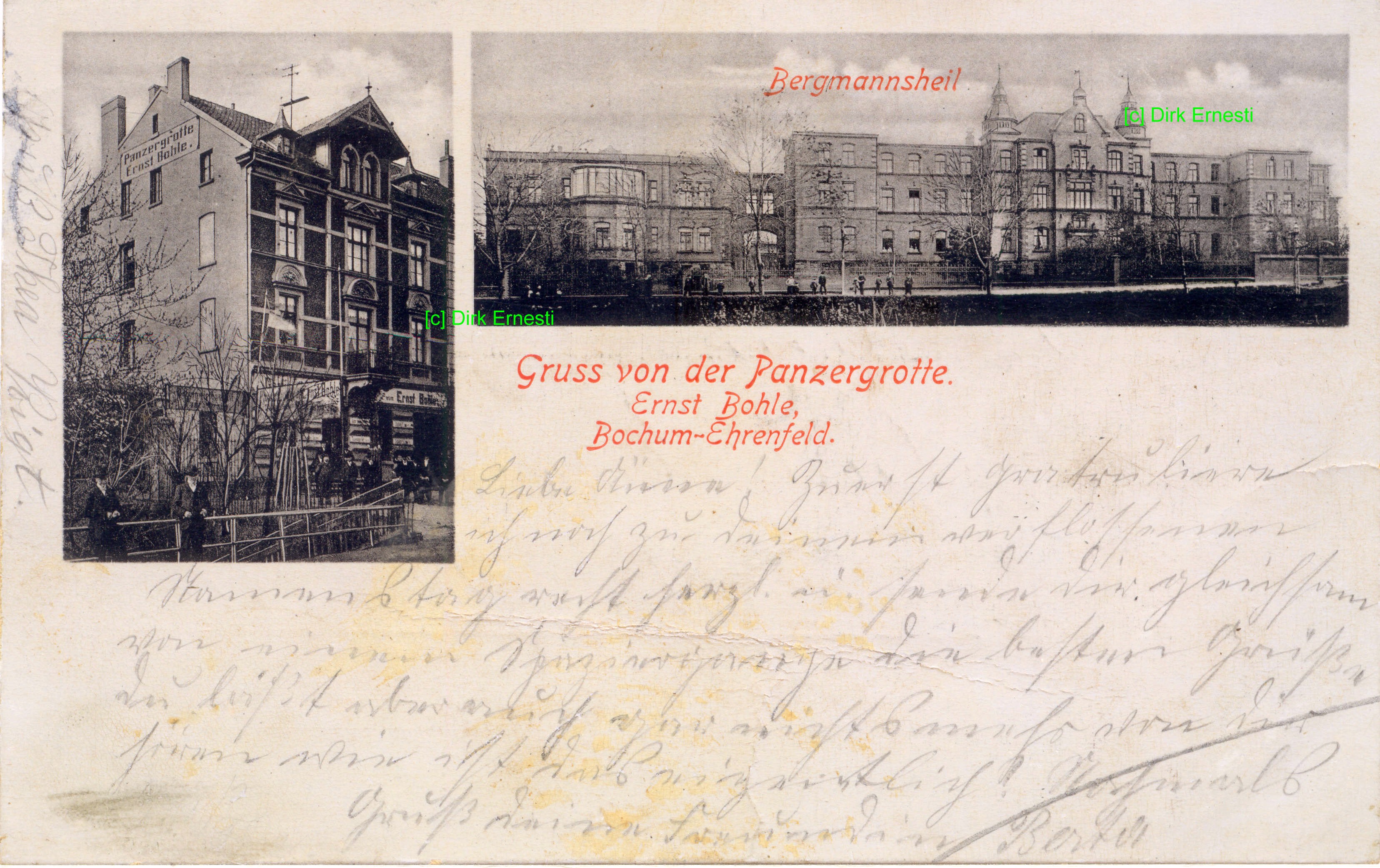 (Inhaber Carl Driefer). Ansichtskarte von 1894. Bisher älteste Ansichtskarte, die wir gefunden haben! - weitere Ansichten weiter unten. ... befand sich etwa auf Höhe des Bergmannsheils an der Hattinger Straße Nr. 80. Interessant: das Ehrenfeld wird schon vor dem Jahr 1900 erwähnt. (Karte noch größer sehen - hier klicken!) |