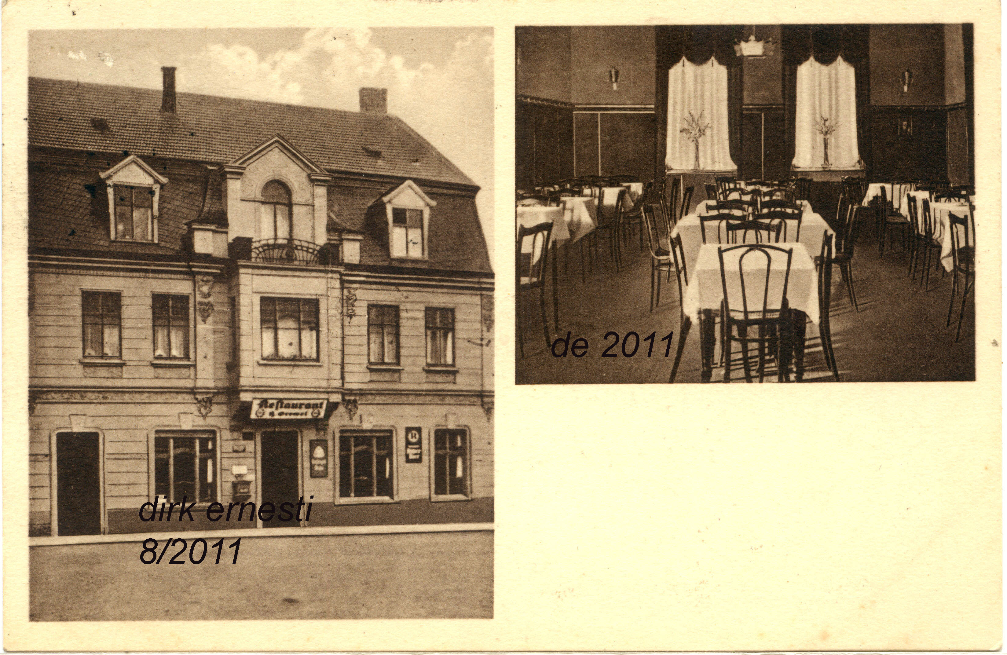 Ansichtskarte um 1930. befand sich in der Ottostraße (Oskar-Hoffmann-Str.), Ecke Kronenstraße. Das Gebäude ist nicht erhalten. Die Ottostraße verläuft hier links im Bild (Straßenbahnschienen) (Karte noch größer sehen - hier klicken!) |