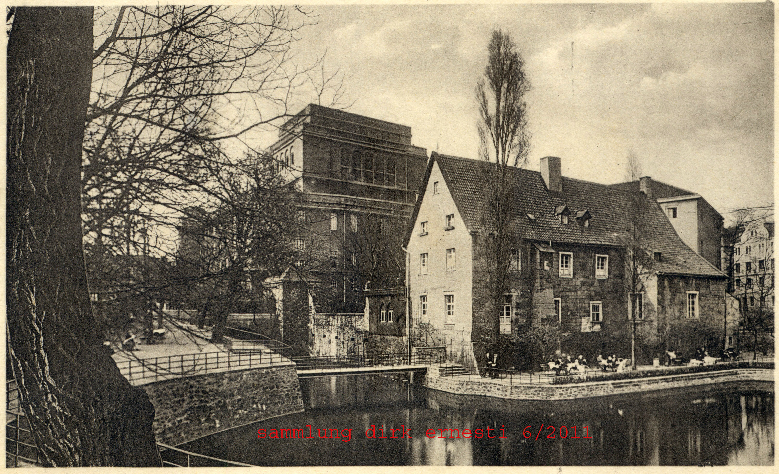 Ansichtskarte von 1907. Verglichen mit obiger Ansicht von der gegenüberliegenden Seite auf die Brücke über den Wassergraben gesehen. Im Hintergrund Häuser am Westfalenplatz, das Stadttheater existierte zum Zeitpunkt dieser Aufnahme noch nicht. (Foto noch größer sehen: - hier klicken!) |