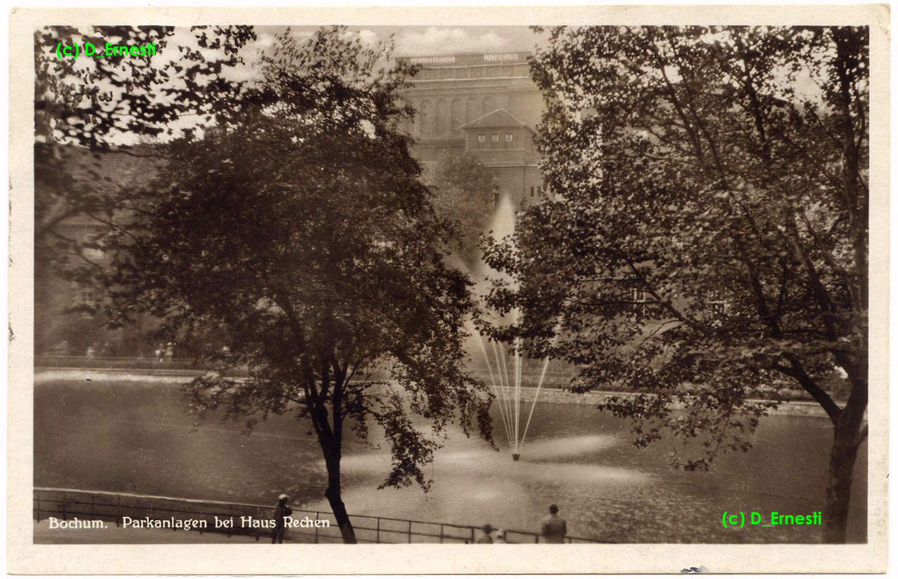 Echtfoto-Postkarte, benutzt 1941. Gesehen von der Terasse des Hotels Haus Rechen.Mit Wassergraben ("Rechener Weiher") und verweilenden Personen auf Parkbänken am Museum, gut auf der vergrößerten Ansicht zu sehen. (Foto - 600 dpi-Datei! - größer sehen: - hier klicken!) |