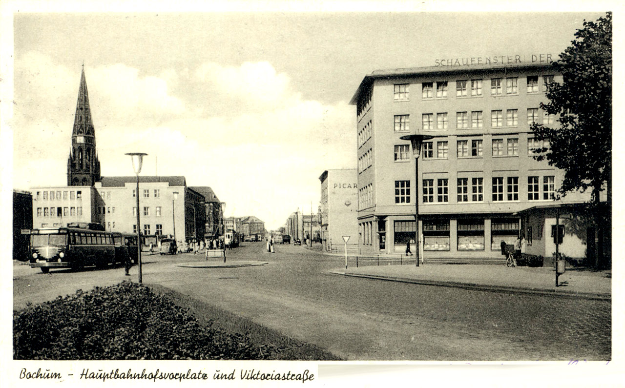 Ansichtskarte von 1956. An dieser Stelle befindet sich heute der Anfang der Kneipenmeile "Bermuda Dreieck", auf dem Foto links erkennt man die Häuser der Hattinger Str., heute Alte Hattinger Straße. (Foto noch größer sehen - hier klicken!) |