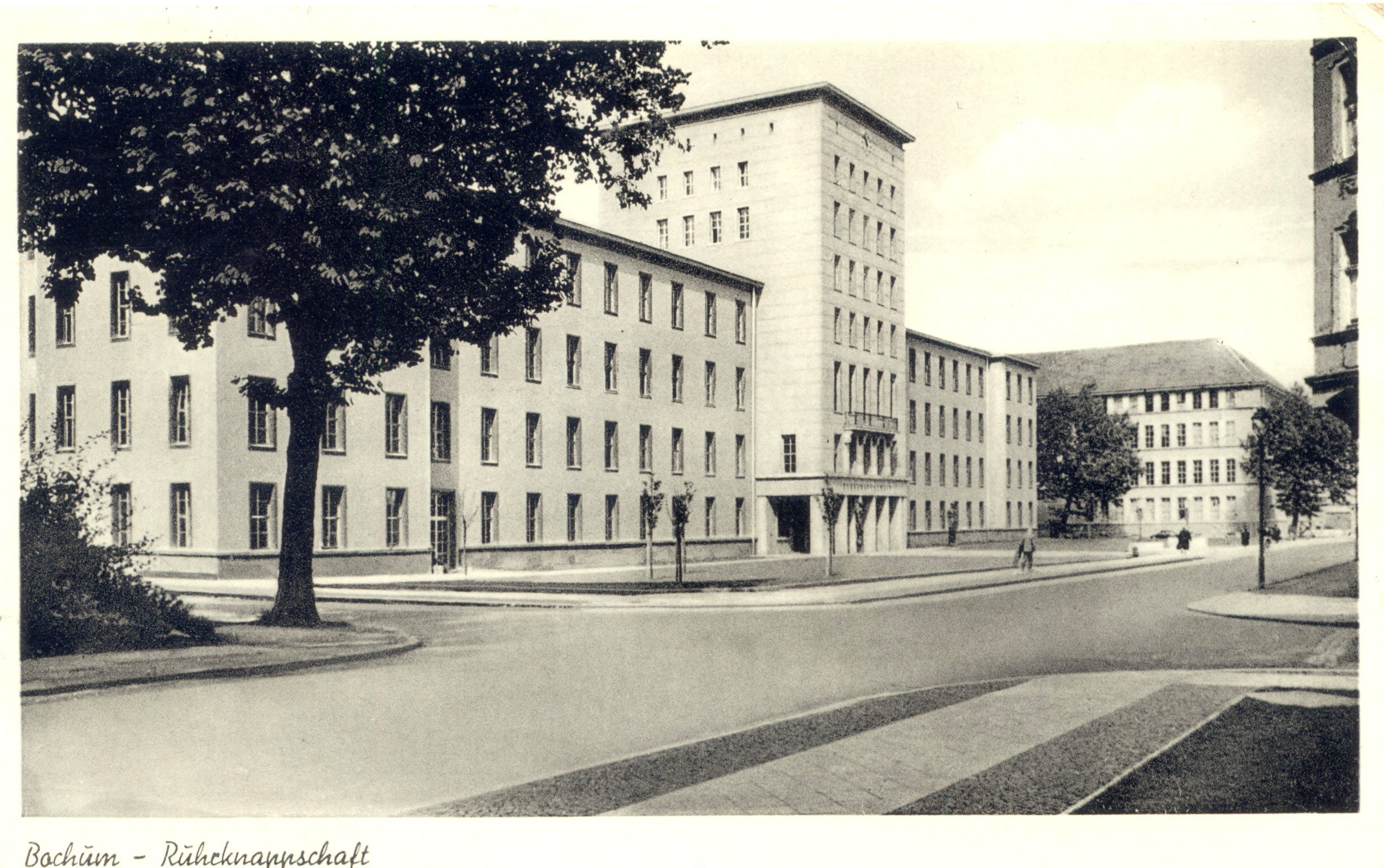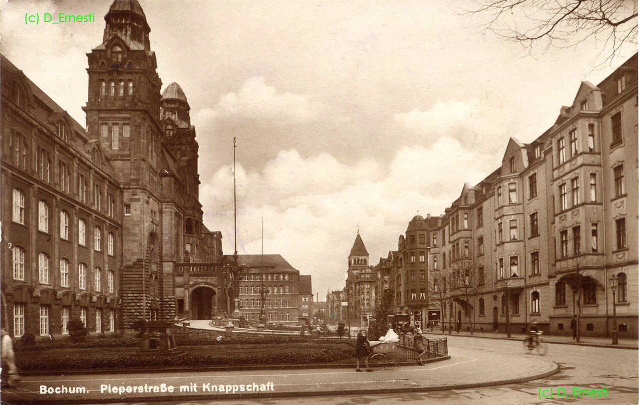 Ansichtskarte von 1910. Gebäude der Hauptverwaltung, offenbar kurz nach dessen Fertigstellung. Im Vordergrund kreuzen sich die Weiherstraße und Pieperstraße, Blickrichtung nach Süd-Westen. Lesen Sie Informationen zur Geschichte